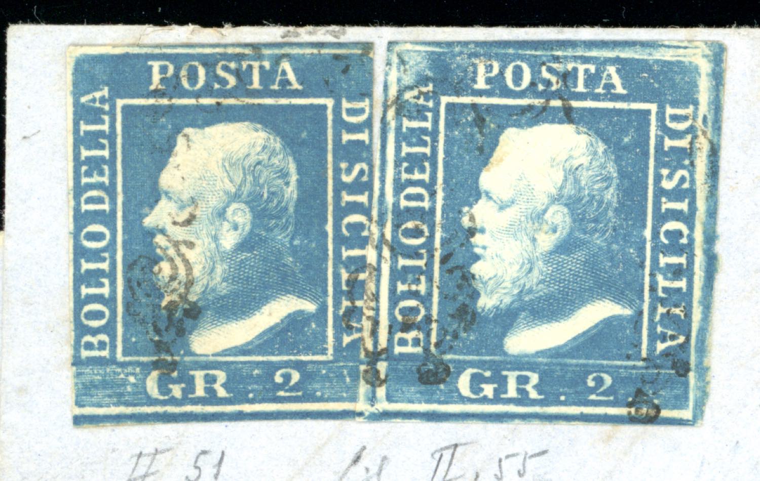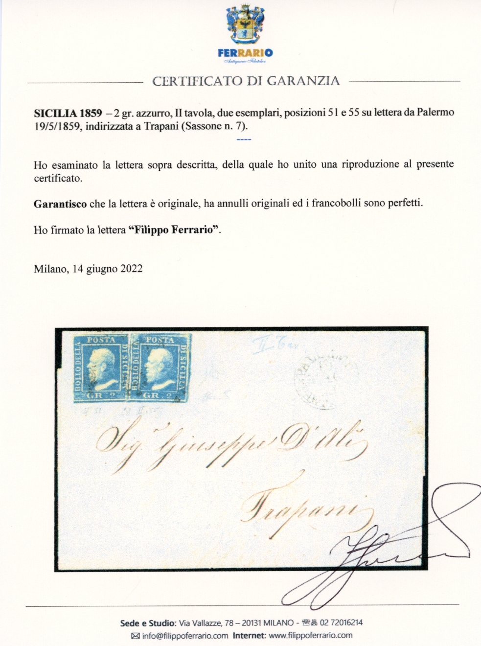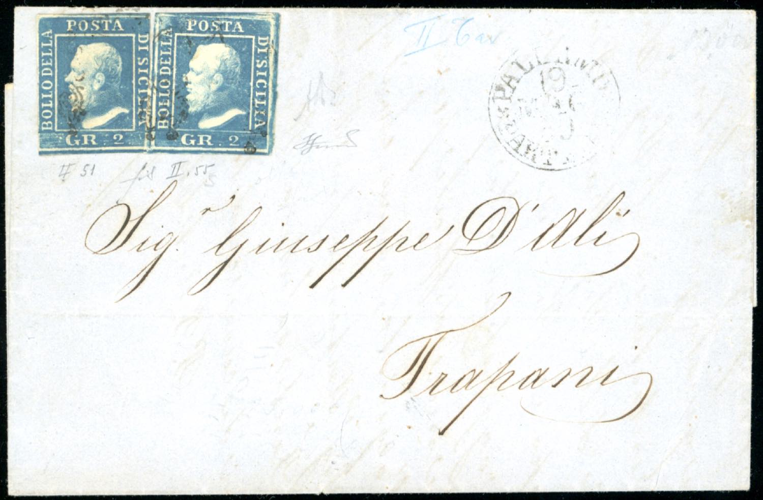 1859 - 2 grana azzurro, II tavola (7), due esemplari, pos. 51 e 55, perfetti, su lettera da Palermo 19/5/1859 a Trapani. A.Diena, Fiecchi, Ferrario.