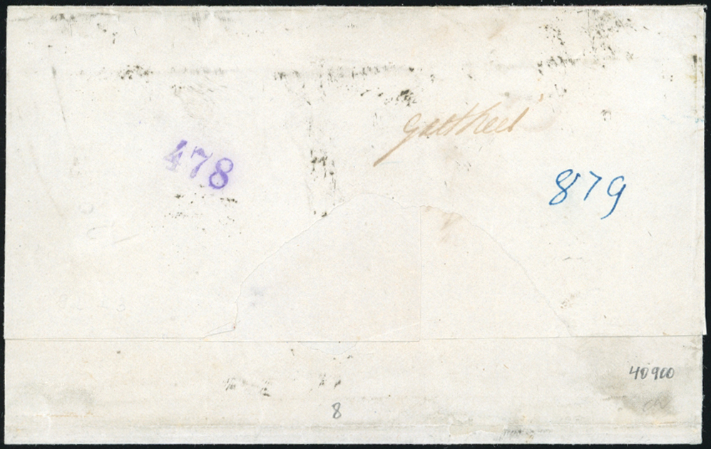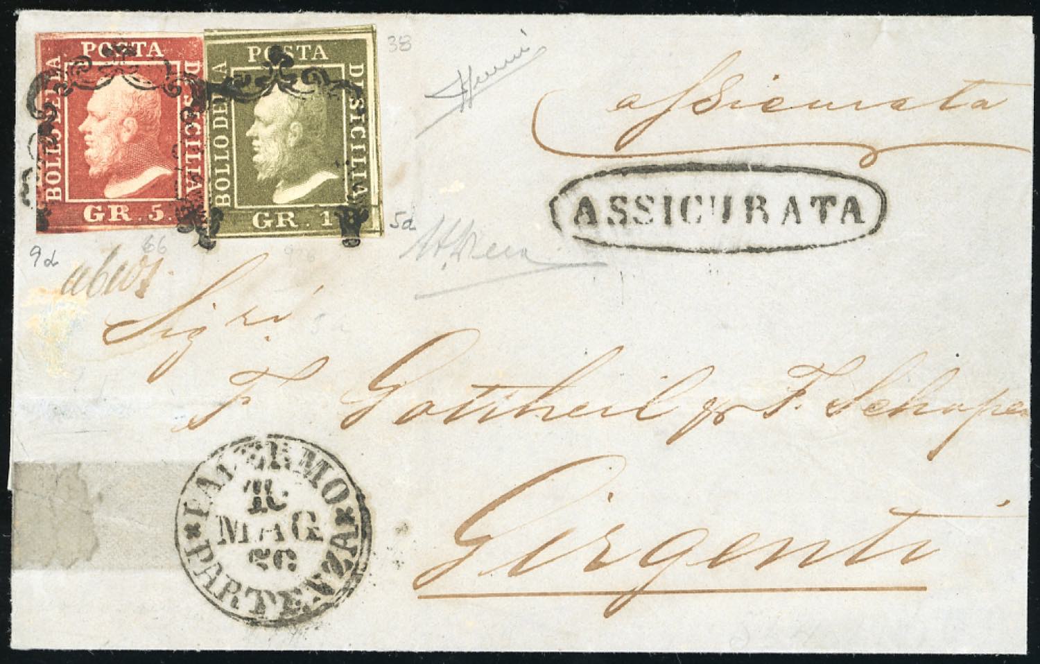1859 - 5 grana rosso brunastro, I tavola, 1 grano verde oliva, III tavola (5a,9d), ottimo stato, su sovracoperta di lettera assicurata da Palermo 10/5/1859 a Girgenti. Raro colore. A.Diena, cert. Sorani.