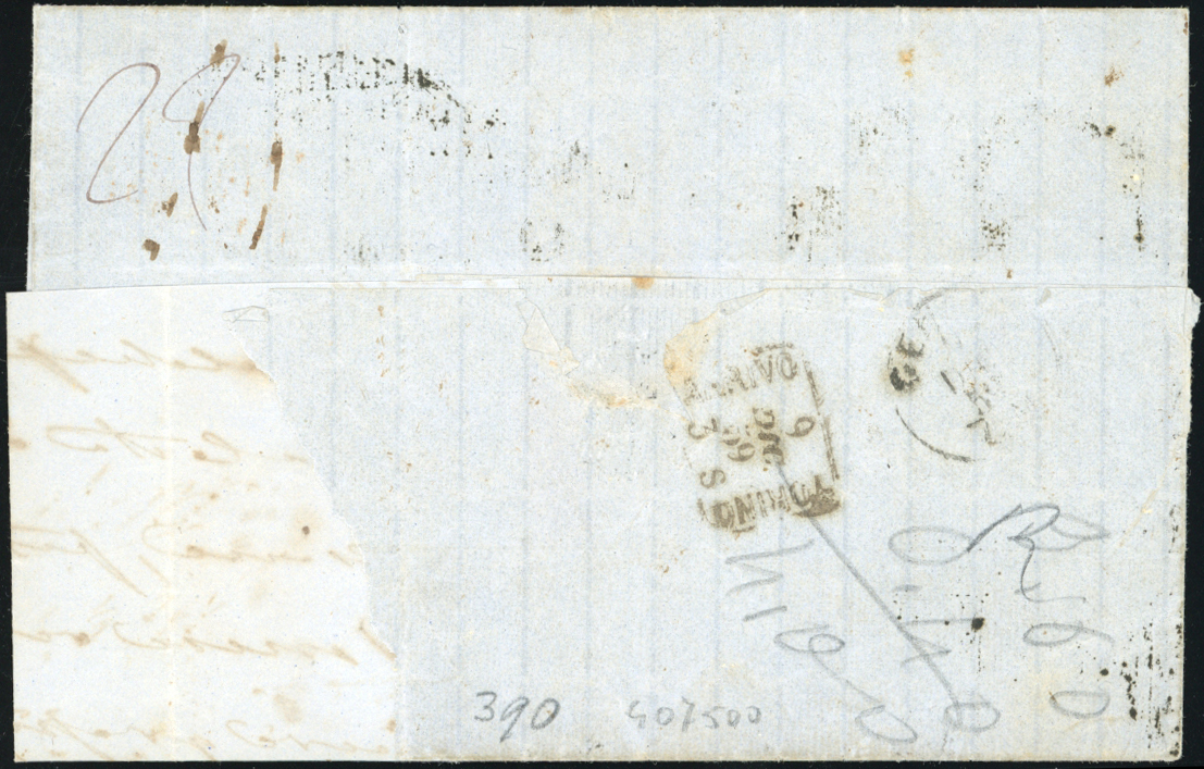 1859 - 20 grana grigio ardesia, 2 grana azzurro, I tavola (13,6), perfetti, su sovracoperta di lettera, parzialmente incompleta, da Messina 5/12/1859 a Torino, con i Piroscafi postali francesi, tassata. A.Diena, cert. Sirotti.