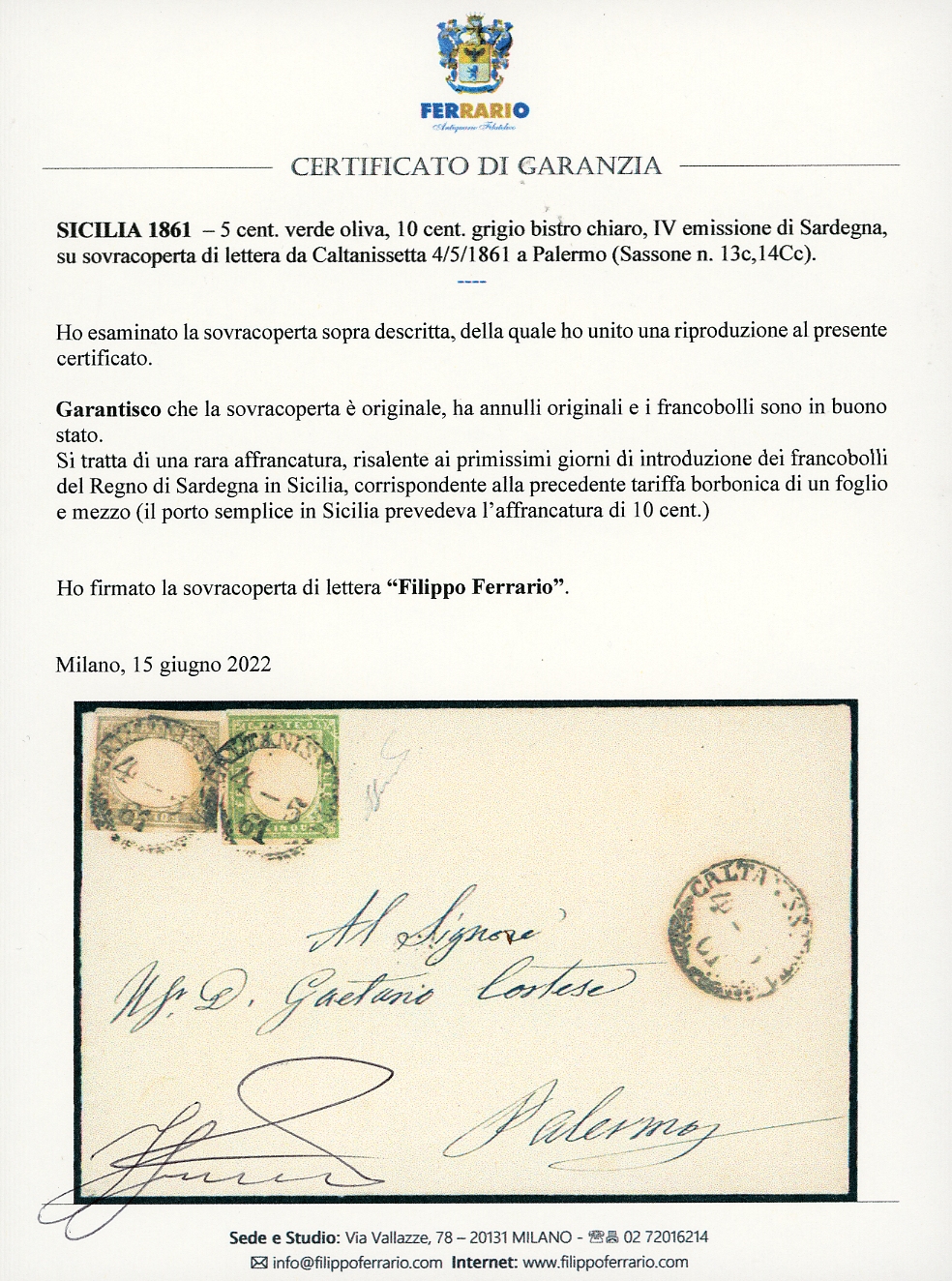 1861 - 5 cent. verde oliva, 10 cent. grigio bistro chiaro IV emissione di Sardegna (13C,14Cc), su sovracoperta di lettera da Caltanisetta 4/5/1861 a Palermo. Rarissima affrancatura, risalente ai primissimi giorni di introduzione dei francobolli sardi, corrispondente alla precedente tariffa borbonica di un foglio e mezzo (il porto semplice in Sicilia era di 10 cent). Pochissimi casi noti, per specialista. Cert. Ferrario.
