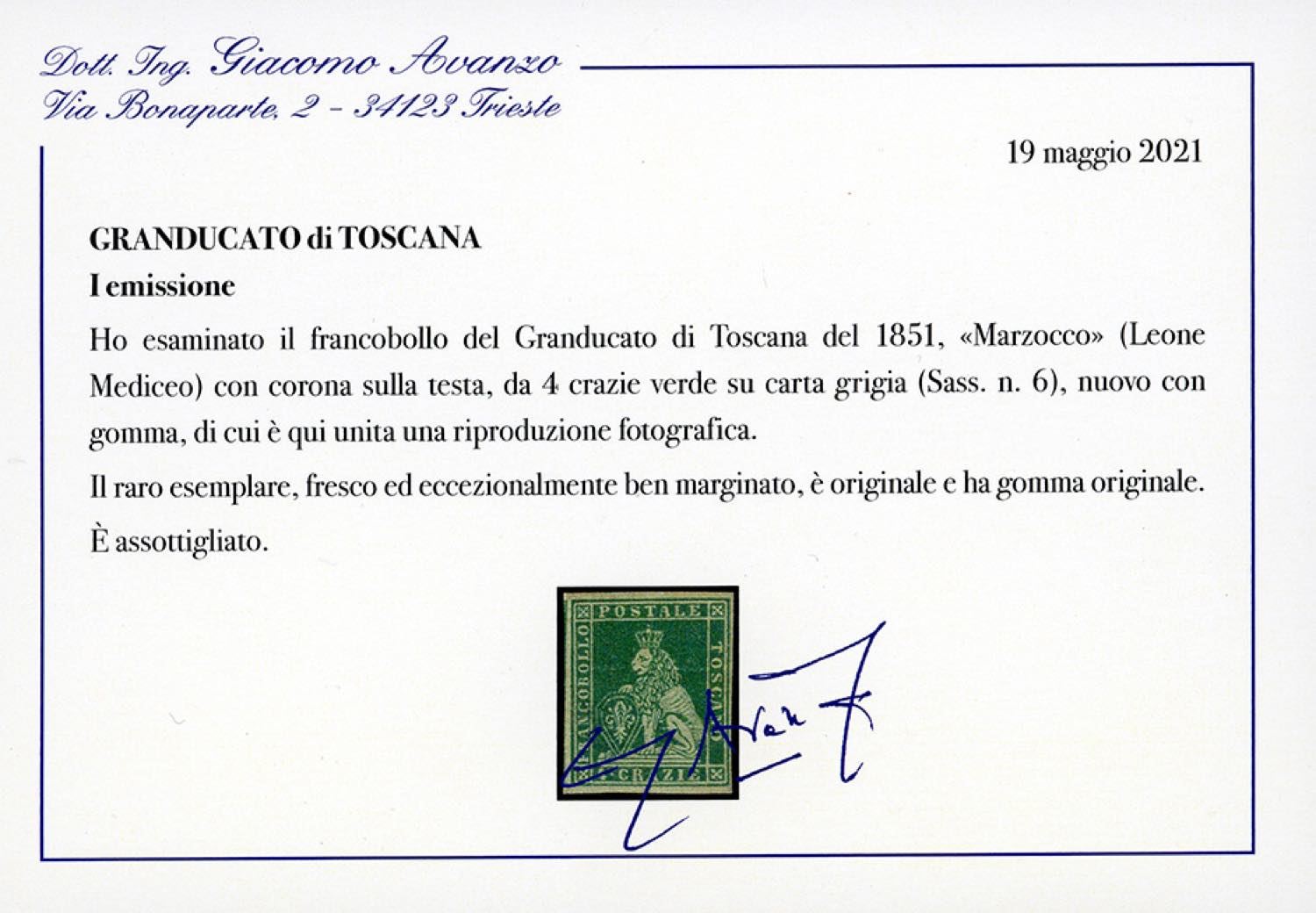 1851 - 4 crazie verde su grigio (6), gomma originale, grandi margini su tutti i lati, lieve assottigliamento al verso. Splendido aspetto, occasione. Cert. Avanzo.