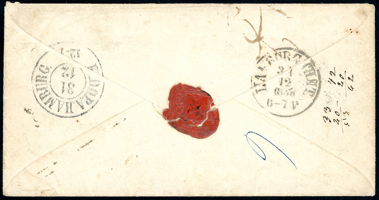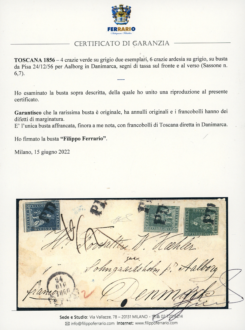 1856 - 4 crazie verde su grigio, due esemplari, 6 crazie ardesia su grigio (6,7), difetti di marginatura, su busta da Pisa 24/12/1856 per la Danimarca, segni di tassa sul fronte e al verso. Si tratta dell'UNICA LETTERA NOTA AFFRANCATA dalla Toscana alla Danimarca. Rarità del settore. Inedita finora, frutto di un recente ritrovamento. Cert. Ferrario.