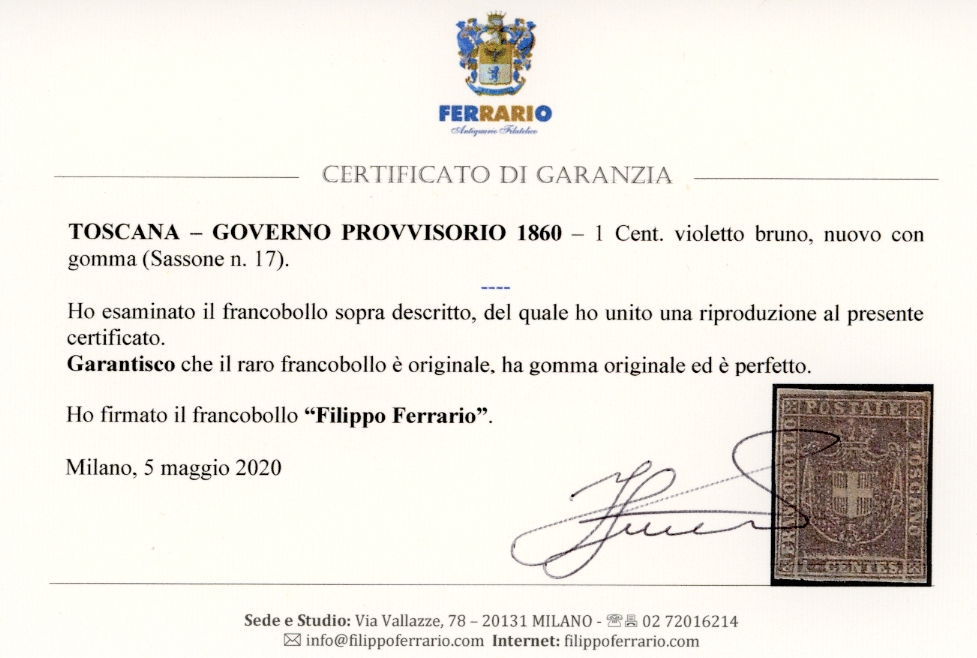 1860 - 1 cent. violetto bruno (17), nuovo, gomma originale, perfetto. Molto fresco e raro. A.Diena, G.Oliva, cert. Ferrario.