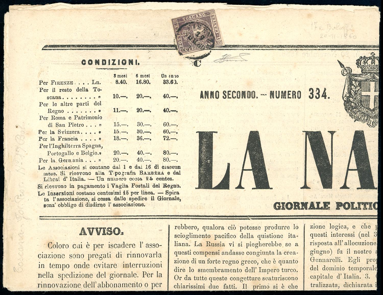 1860 - 1 cent. violetto bruno (17), perfetto e ben marginato, isolato su giornale "La Nazione" usato a Firenze 29/11/1860. Bello! Ferrario.
