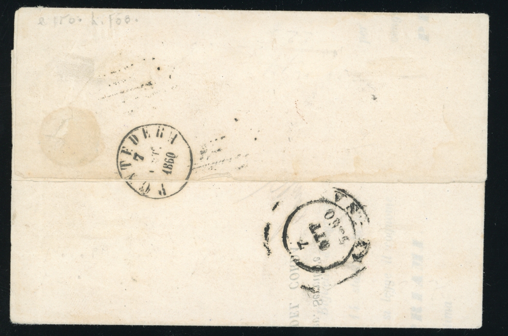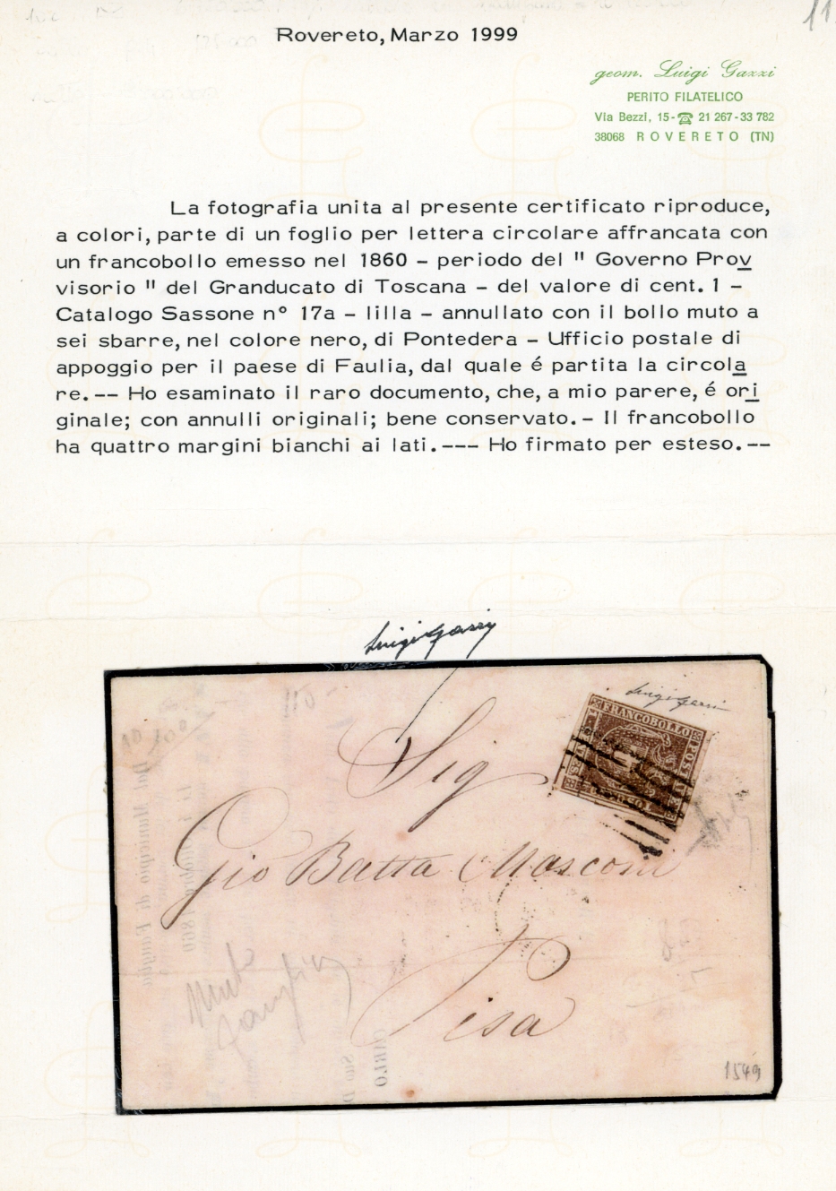 1860 - 1 cent. bruno lilla (17b), perfetto, isolato su circolare a stampa da Fauglia a Pisa 7/10/1860. Raro uso isolato su circolare, di ottima qualità. Sorani, cert. Colla.