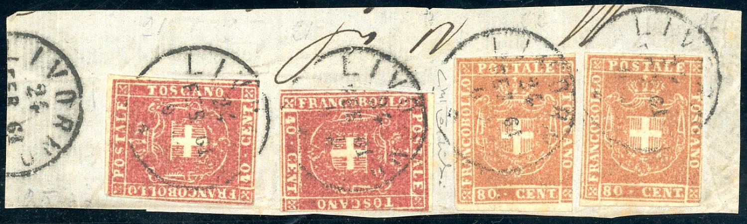 1860 - 80 cent. carminio, 40 cent. carminio, entrambi due esemplari (22,21), difetti di marginatura, usati su frammento a Livorno ... Read more