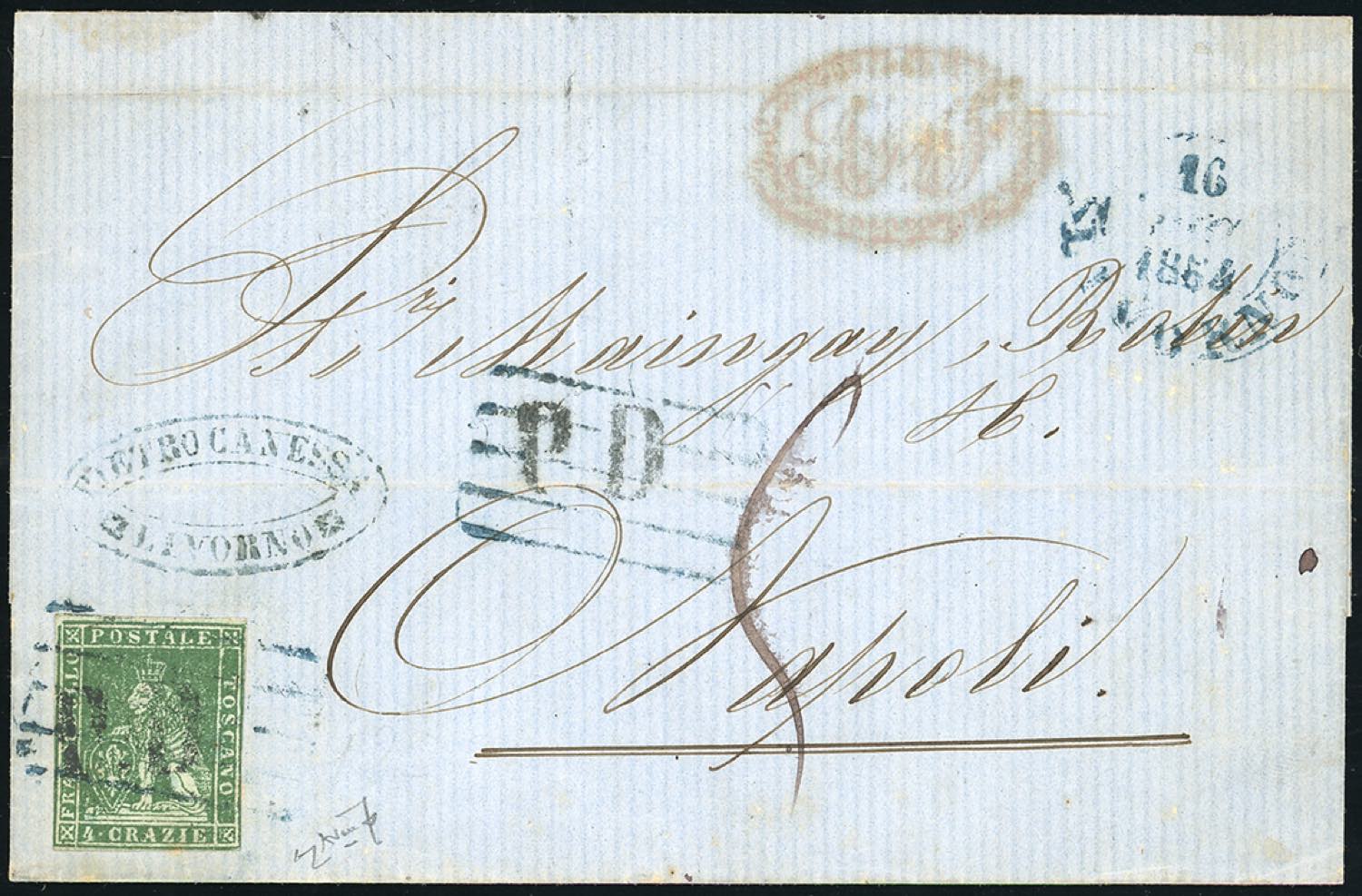 LIVORNO, muto a cinque sbarre spaziate azzurro + PD coannullatori, punti 9 - 4 crazie (6d), margini a filo, su sovracoperta di lettera del 16/12/1854 a Napoli, transito per lo Stato Pontificio al verso, tassata 5 grana. Dettagliato cert. Avanzo.