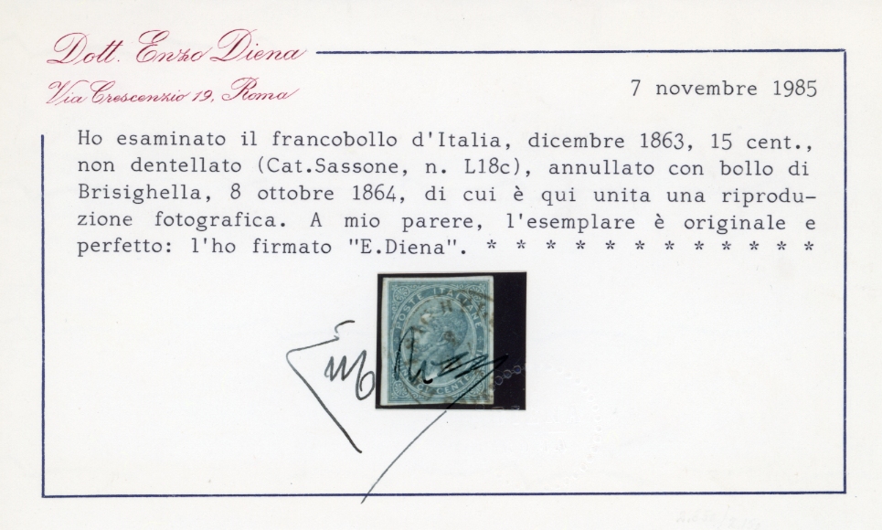1863 - 15 cent. De La Rue, non dentellato (L18c), perfetto, usato a Brisighella. Pregevole l'uso in una località diversa da Lugo. Em.Diena, cert. E.Diena.
