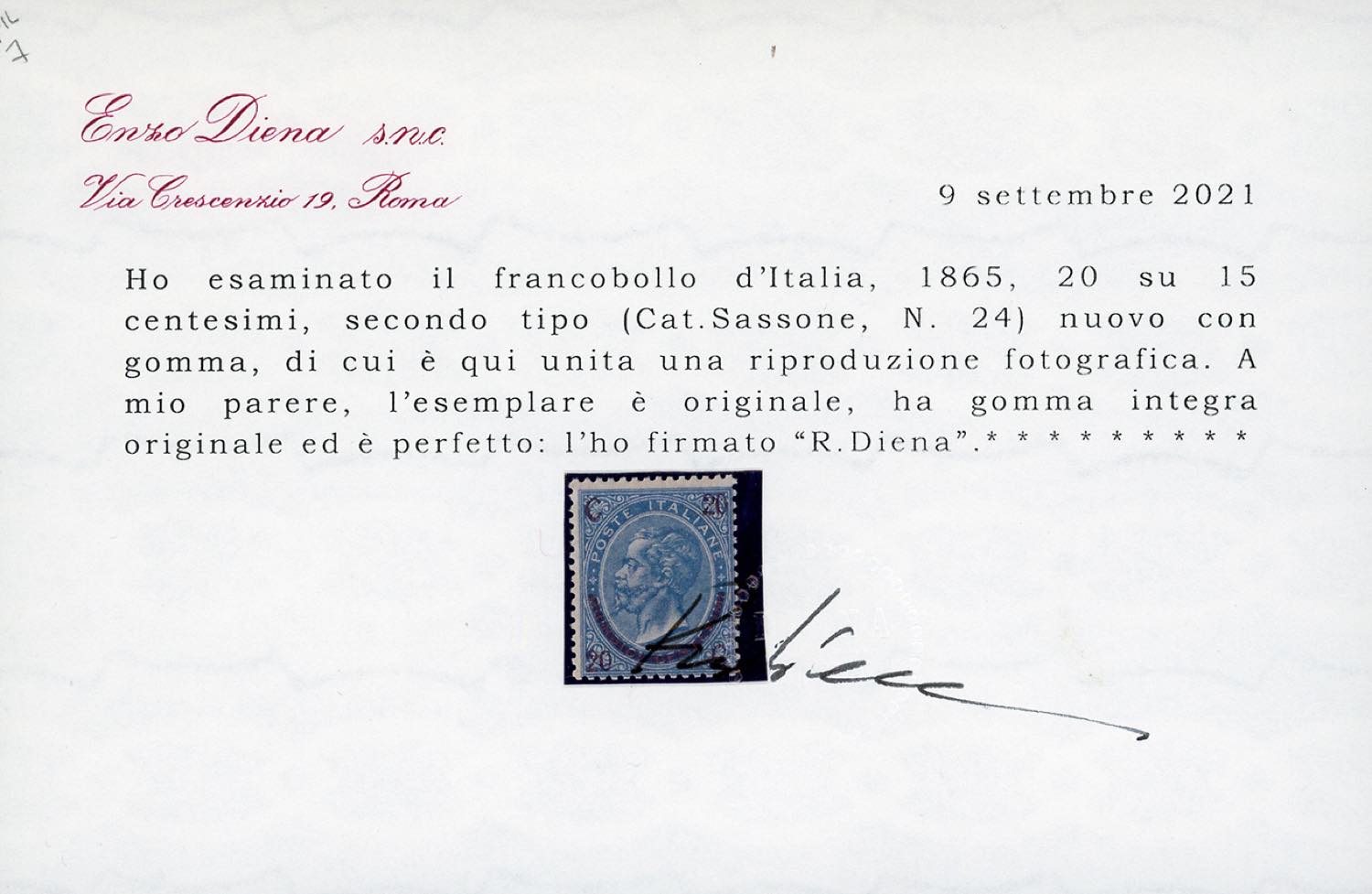 1865 - 20 cent. su 15 cent. Ferro di cavallo II tipo soprastampato (24), nuovo, gomma originale integra, perfetto. Molto fresco e raro. Cert. Ferrario e Diena.