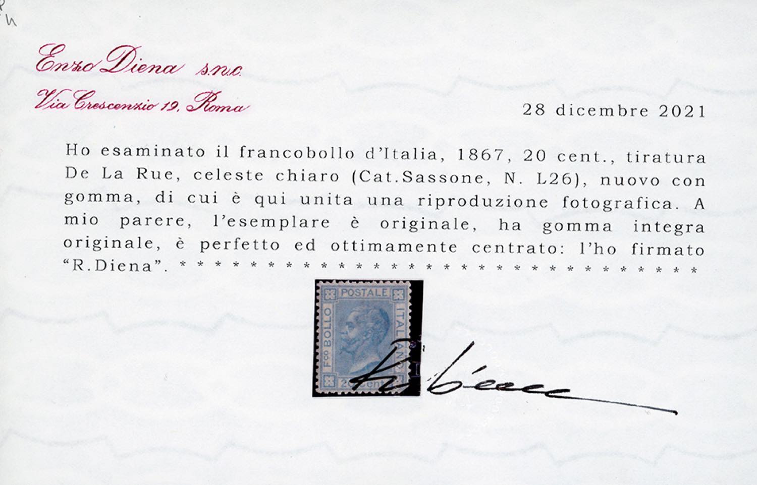 1867 - 20 cent. celeste chiaro, tiratura di Londra (L26), ottima centratura, gomma originale integra, perfetto. Bellissimo. Cert. Diena.