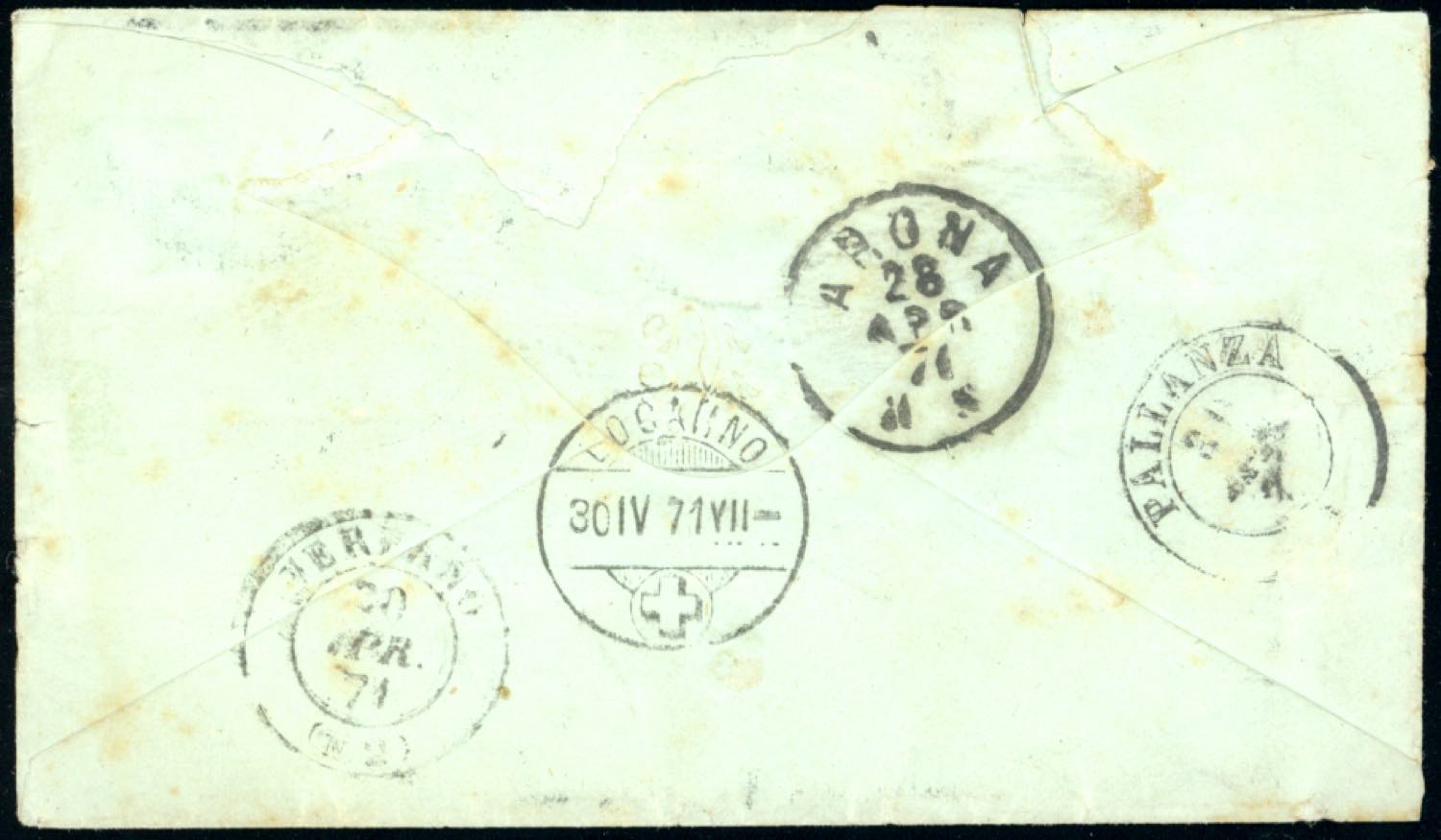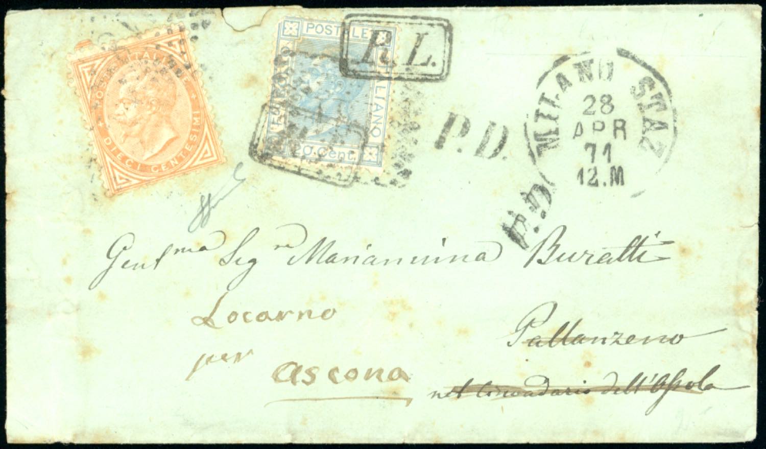 1871 - 20 cent. azzurro, tiratura di Torino (T26), angolo arrotondato, su busta da Milano 28/4/1871 a Pallanzeno, rispedita previa riaffrancatura con 10 cent. De La Rue, tiratura di Torino (T17), a Locarno, Svizzera. Interessante rispedizione in tariffa di raggio limitrofo. Ferrario.