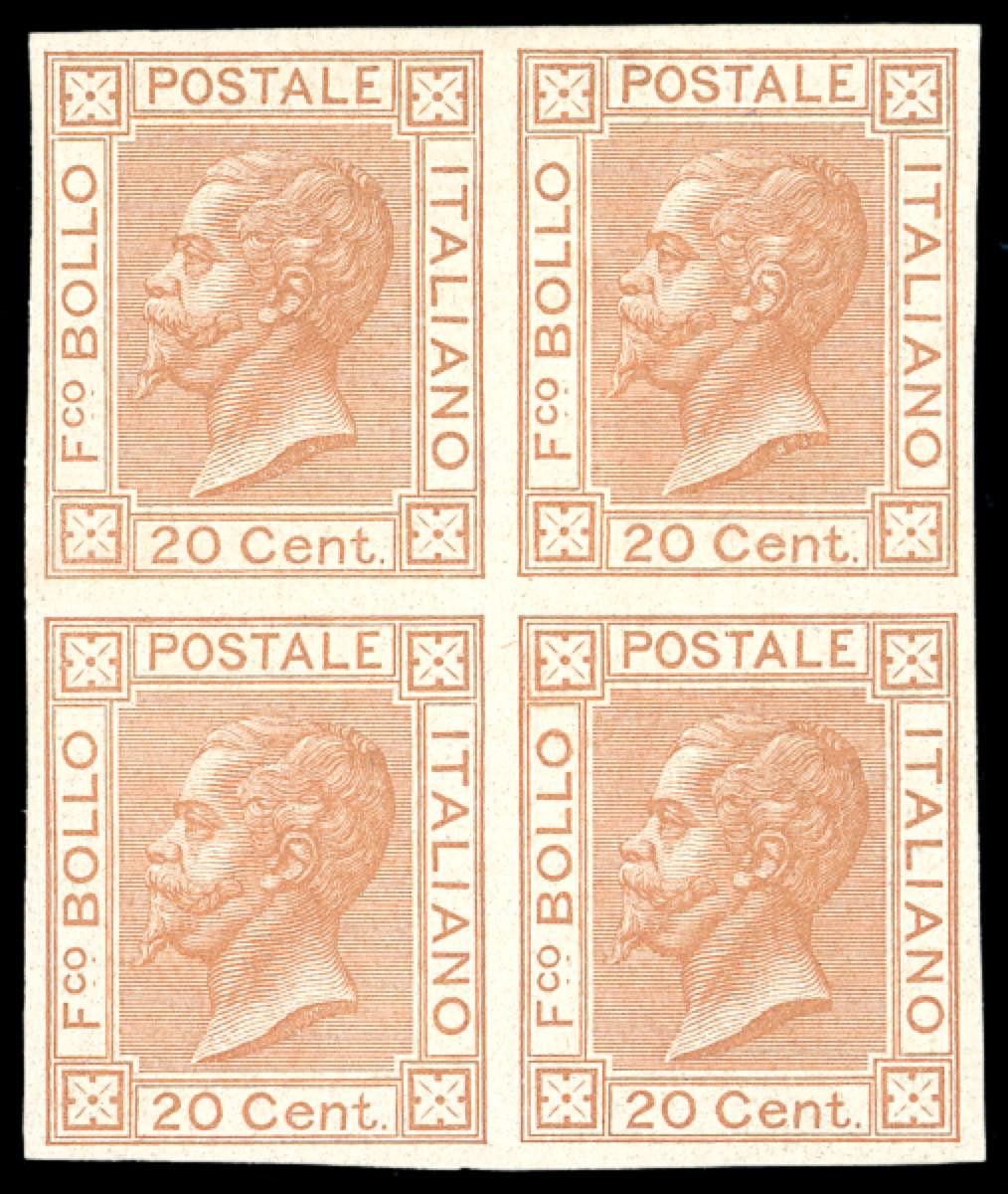 1877 - 20 cent. arancio, prova d'archivio, non dentellata (P28), blocco di quattro, senza gomma, lieve grinza sugli esemplari superiori. ... Read more