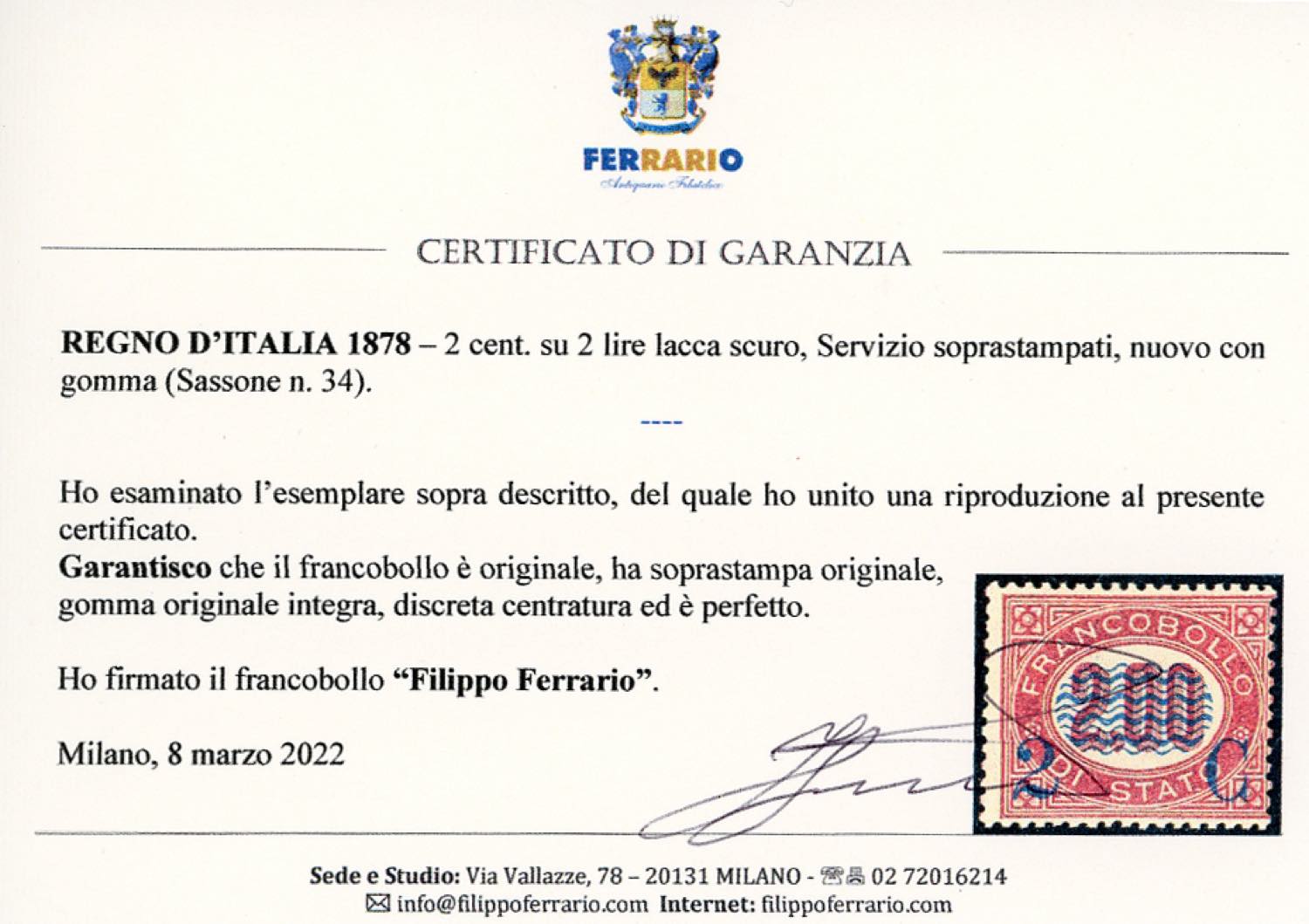 1878 - 2 cent. su 2 lire Servizio soprastampati (34), discreta centratura, gomma originale integra, perfetto. Molto fresco. Cert. Ferrario.