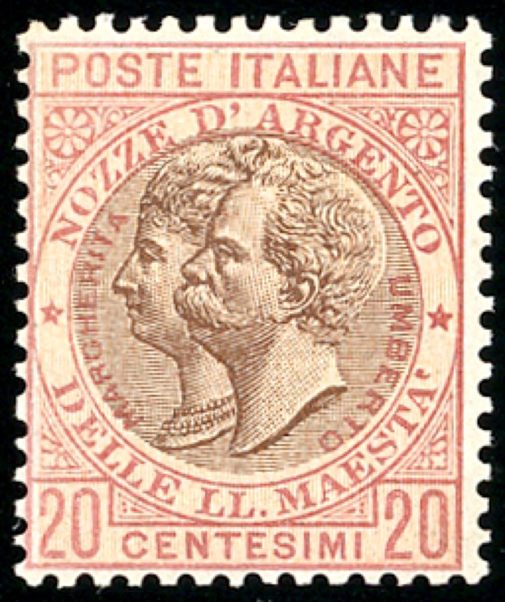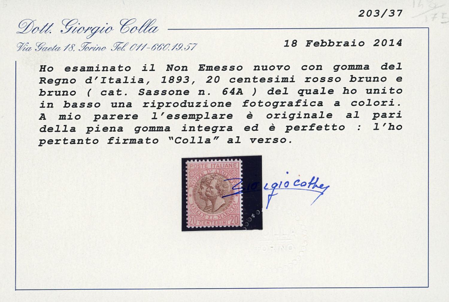 1893 - 20 cent. rosso bruno e bruno Nozze d'argento, non emesso (64A), discreta centratura, gomma originale integra, perfetto. Freschissimo. Cert. Colla.