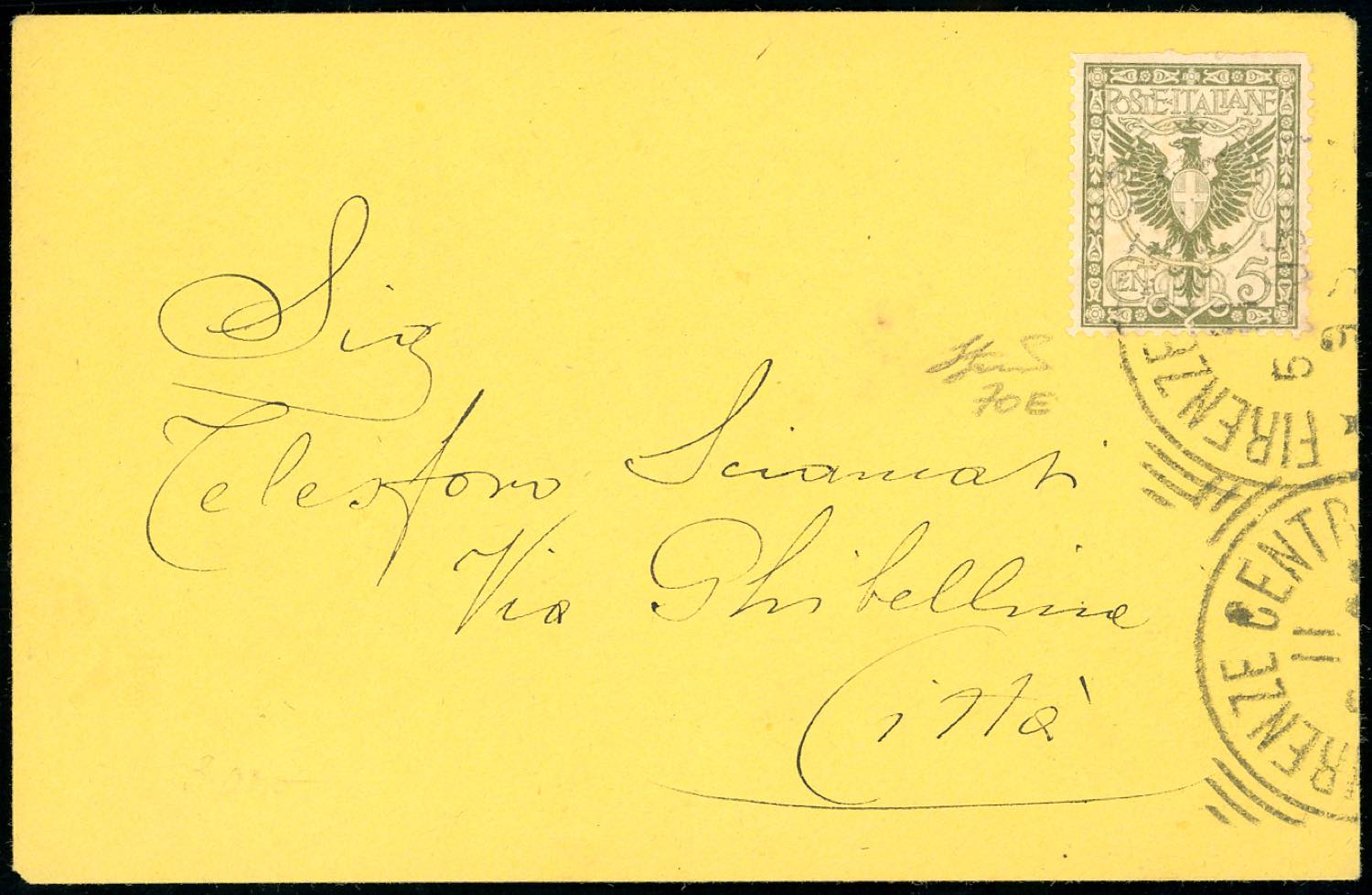 1905 - 5 cent. verde oliva Floreale, prova (70E), perfetto, su busta da Firenze 11/5/1905 per città. Rara. Ferrario.