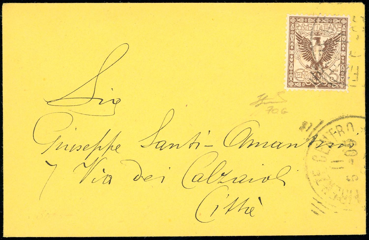 1905 - 5 cent. bruno scuro Floreale, prova (70G), perfetta, su busta da Firenze 11/5/1905 per città. Rara. Ferrario.