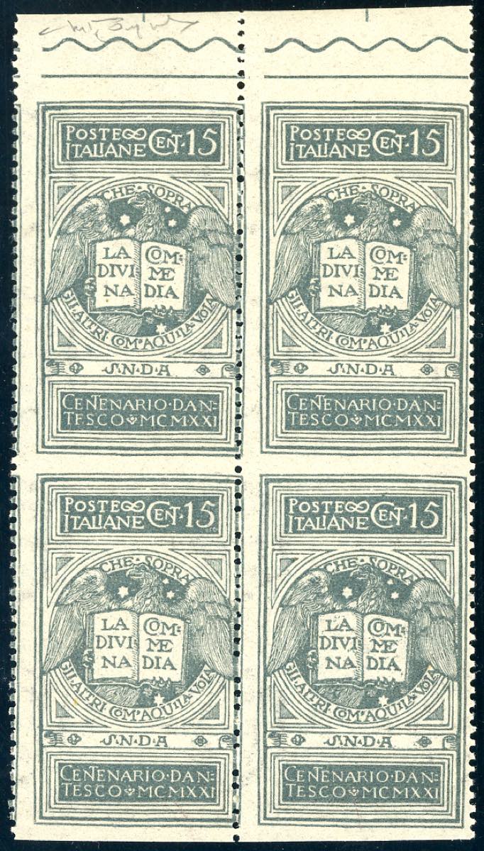 Lot 649 - 1921 - 15 cent. grigio Dante, non emesso, blocco di quattro ...