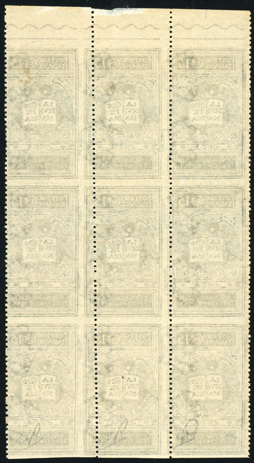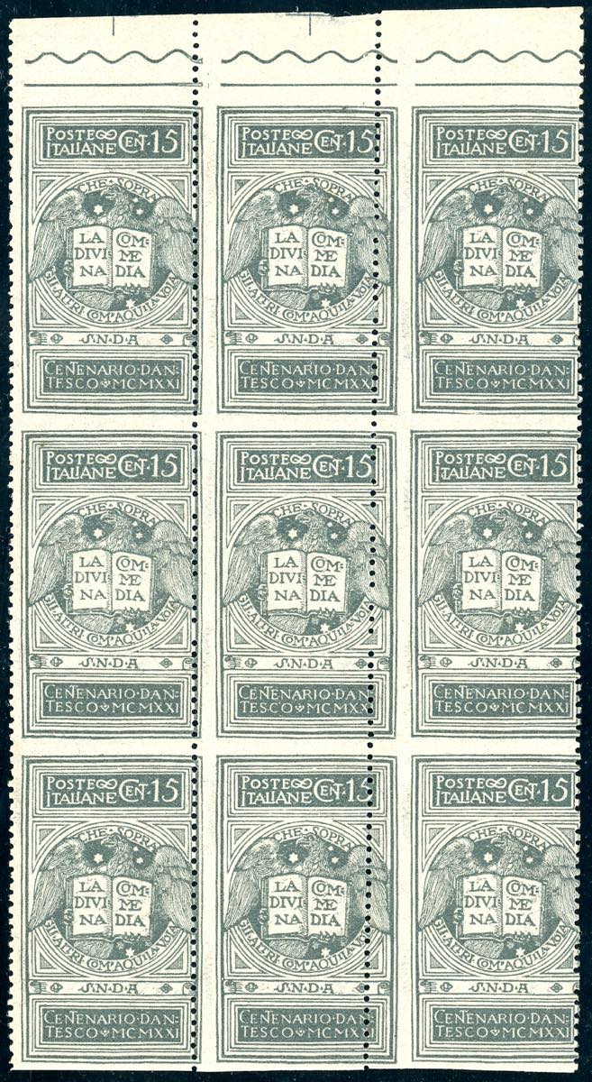 1921 - 15 cent. grigio Dante, non emesso, non dentellato orizzontalmente (116Ag), dentellatura verticale destra fortemente spostata, blocco di nove esemplari, bordo di foglio in alto, gomma originale integra, perfetto.