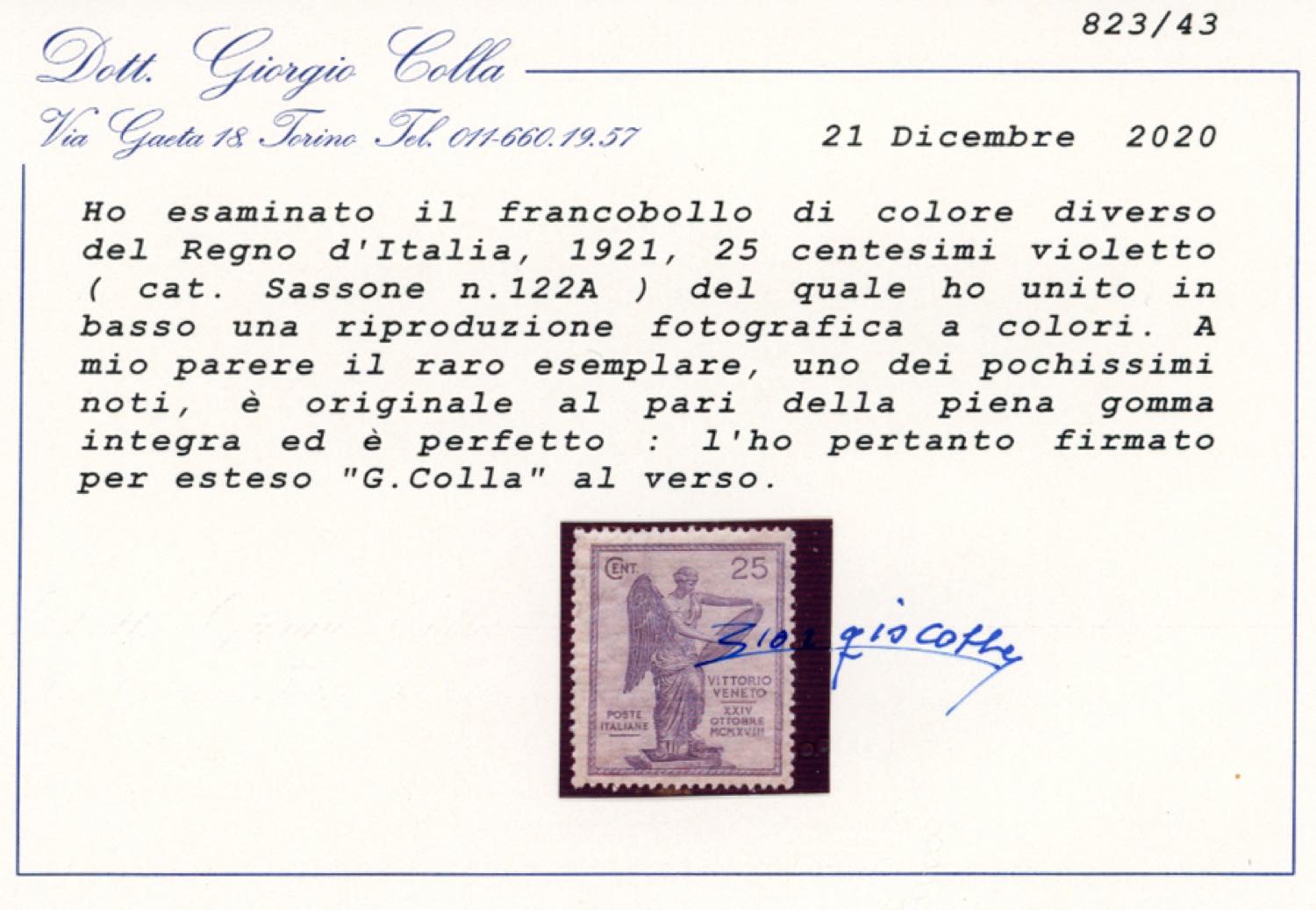 1921 - 25 cent. Vittoria, ERRORE DI COLORE, violetto anziché oltremare (122A), nuovo, gomma originale integra, perfetto. Splendido e rarissimo, solo pochi esemplari esistenti. Cert. Colla.