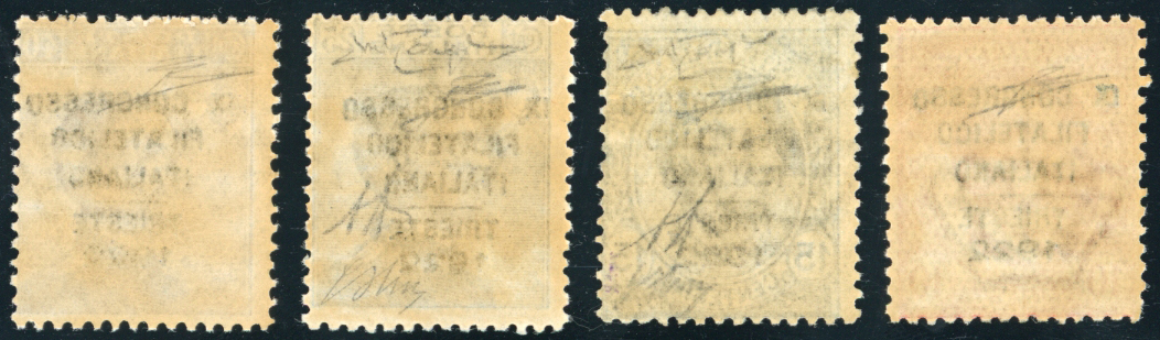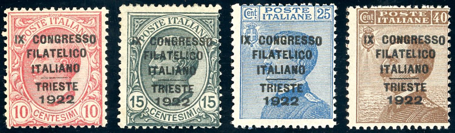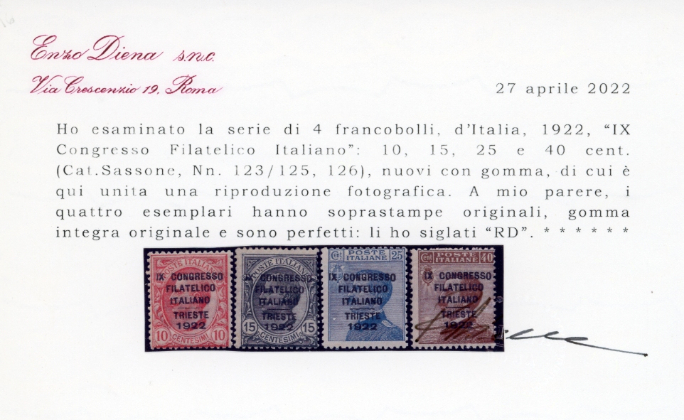 1922 - Congresso Filatelico, soprastampati, serie completa (123/126), nuovi, gomma originale integra, perfetti. Cert. Diena e firme di altri periti noti.