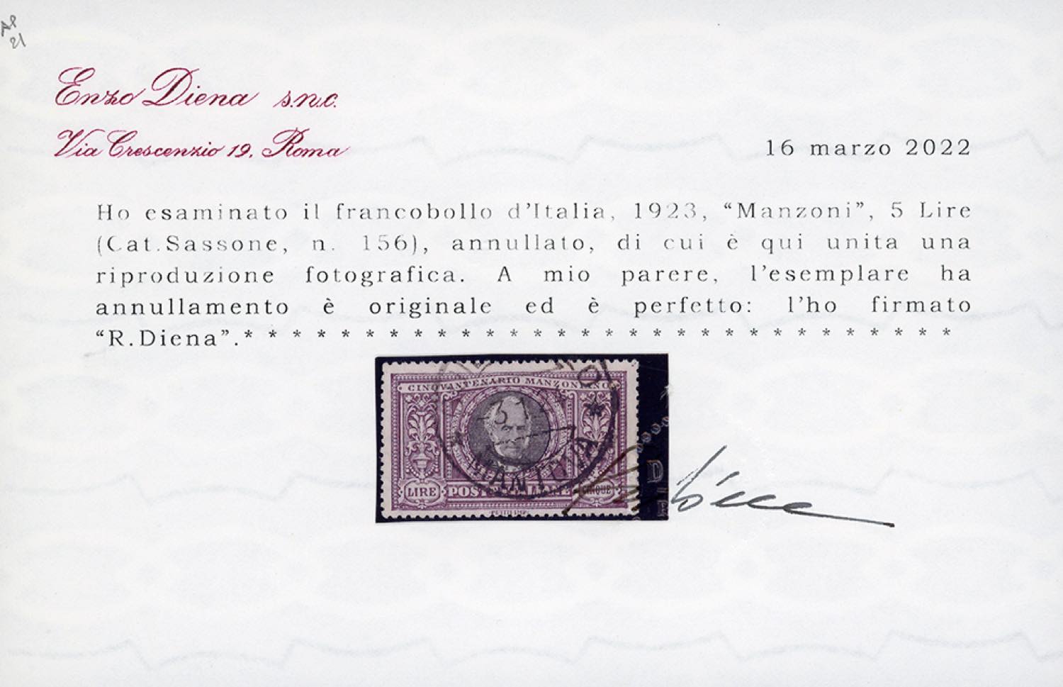 1923 - 5 lire Manzoni (156), usato in periodo di validità a Mantova 3/1/1924, perfetto. Bellissimo e raro. Cert. Diena.