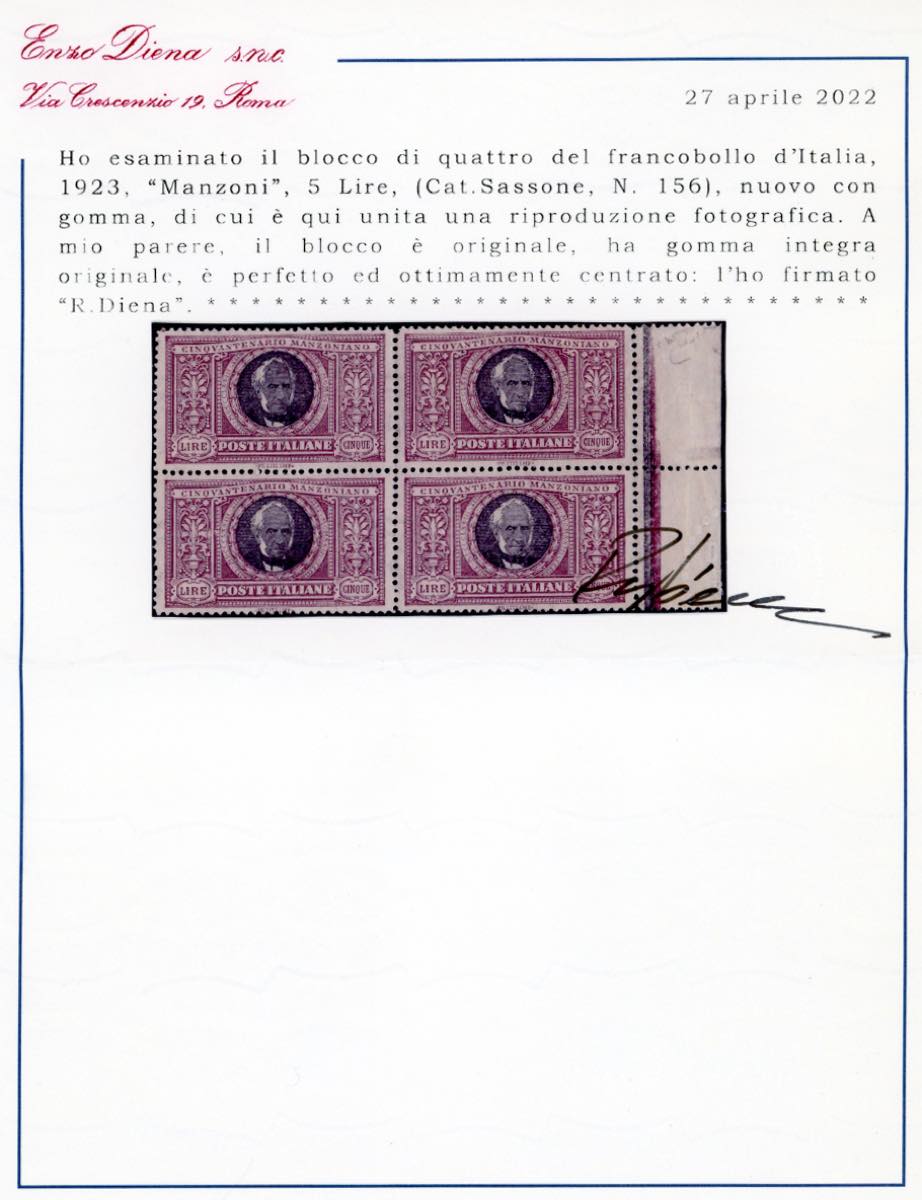 1923 - 5 lire Manzoni, dentellatura lineare anziché a pettine (156c), eccezionale blocco di quattro, bordo di foglio, nuovo, gomma originale integra, perfetto e ben centrato. Splendido e molto raro! Cert. Diena.