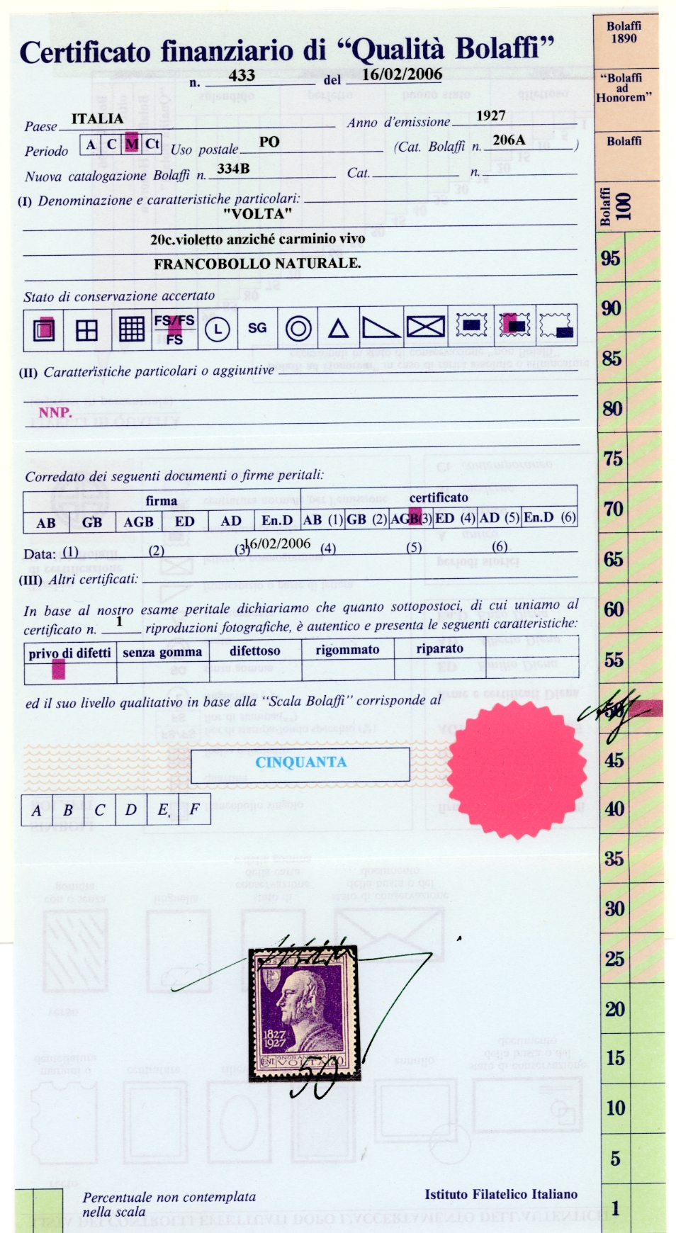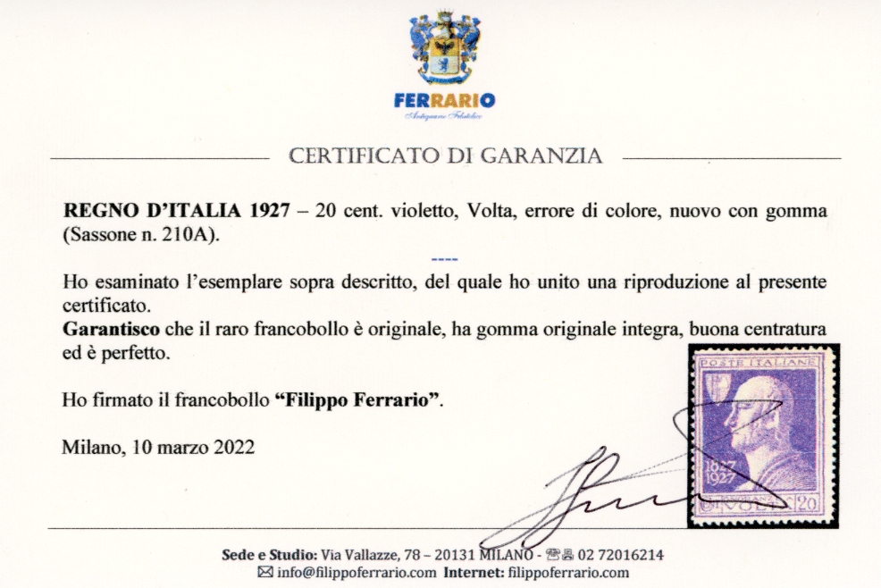 1927 - 20 cent. Volta violetto, errore di colore (210A), nuovo, gomma originale integra, perfetto. Molto fresco, buona centratura per questo raro francobollo che ebbe una tiratura di soli 480 esemplari. Raybaudi, cert. Bolaffi e Ferrario.