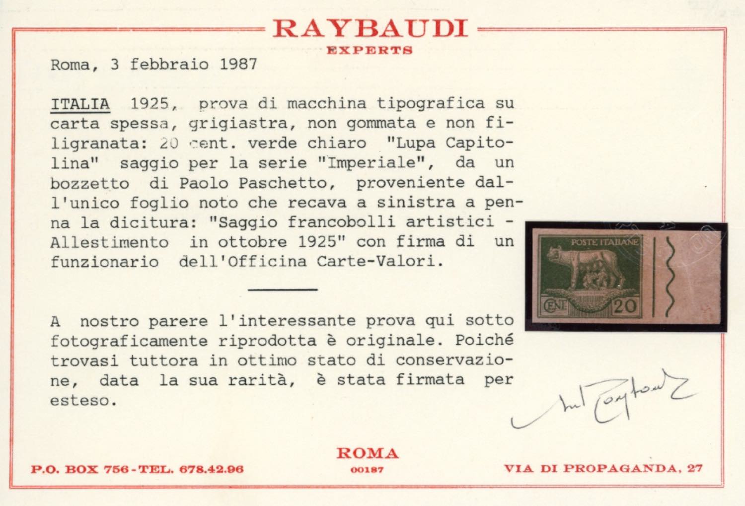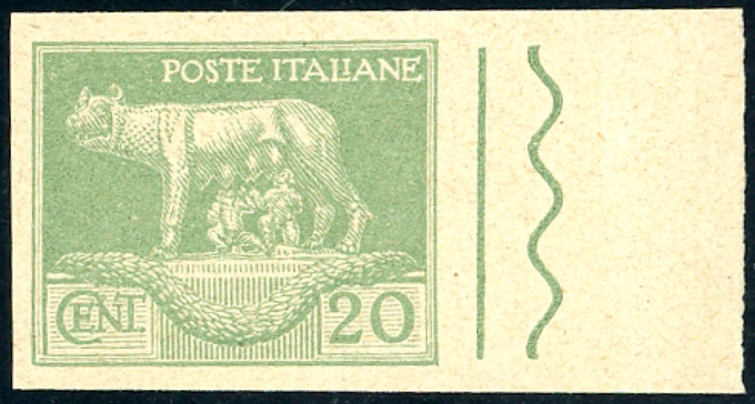 1925 - 20 cent. verde chiaro serie "Artistica", raffigurante la Lupa Capitolina, successivamente adottato con modifiche per la serie Imperiale (Art.2), prova di macchina tipografica su carta grigiastra spessa, non dentellata, bordo di foglio, senza gomma come sempre, perfetta. Molto rara, un solo foglio noto. Cert. Raybaudi.