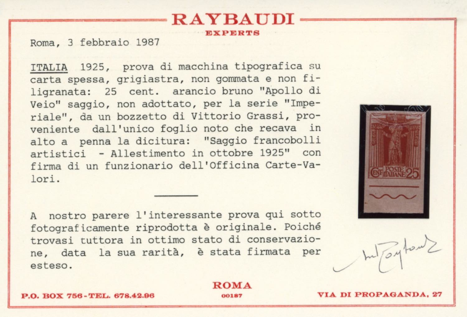 1925 - 25 cent. arancio serie "Artistica", raffigurante l'Apollo di Vejo, soggetto non adottato per la serie Imperiale (Art.3A), prova di macchina tipografica su carta grigiastra spessa, non dentellata, bordo di foglio, senza gomma come sempre, perfetta. Molto rara, un solo foglio noto. Cert. Raybaudi.