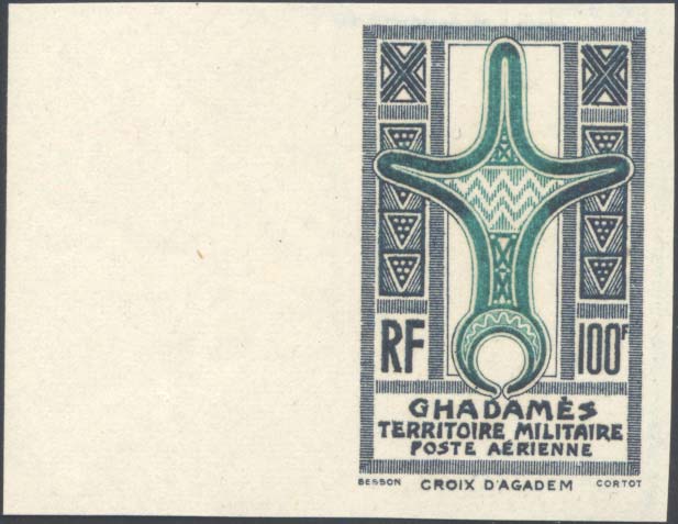 GHADAMES POSTA AEREA 1949 - 100 fr. grigio e verde, ERRORE DI COLORE, non dentellato (A6/ID), bordo di foglio, gomma originale integra, ... Read more
