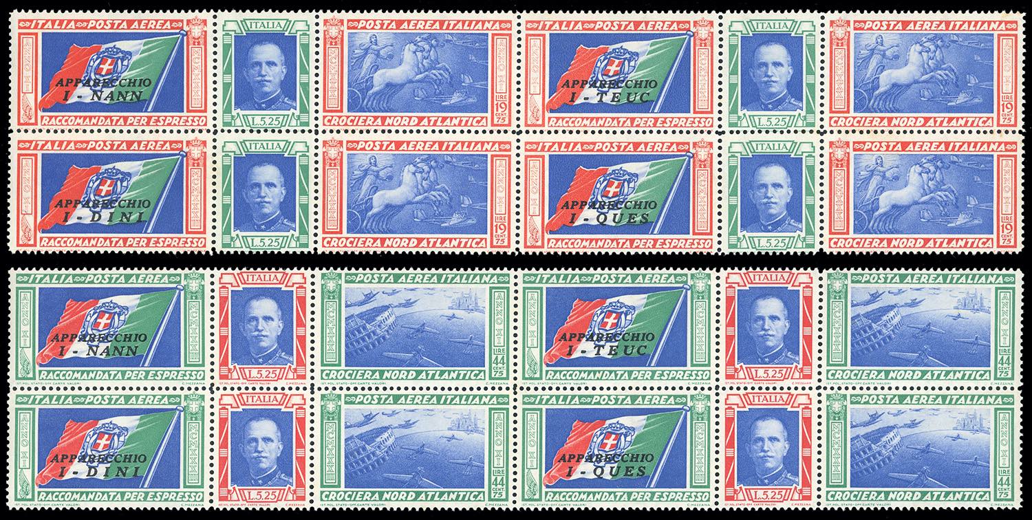 1933 - Trittici, blocchi di quattro con le sigle I-NANN, I-TEUC, I-DINI, I-QUES (51/52L,51/52S,51/52F,51/52O), gomma originale integra, perfetti. Cert. Ferrario.