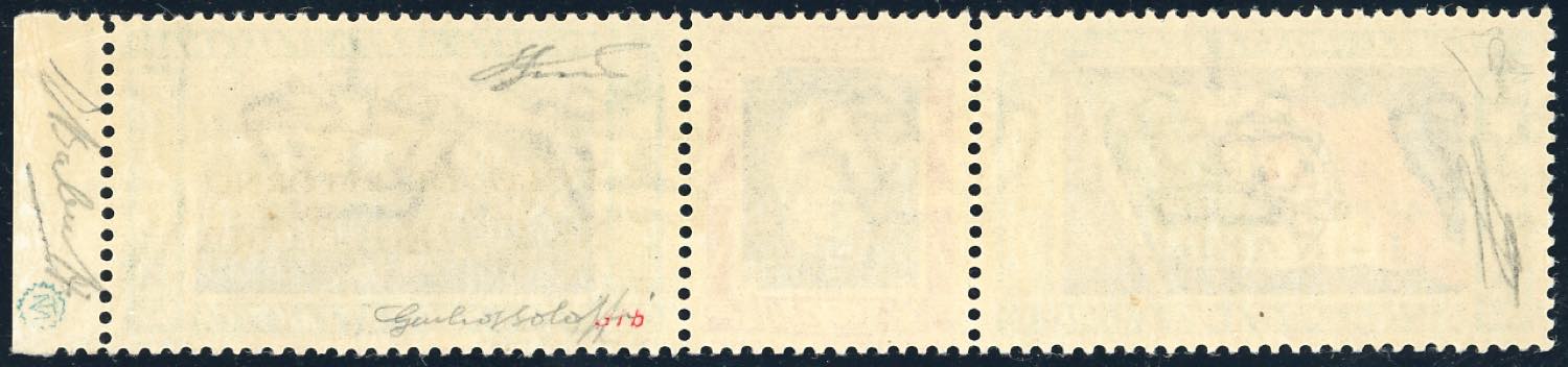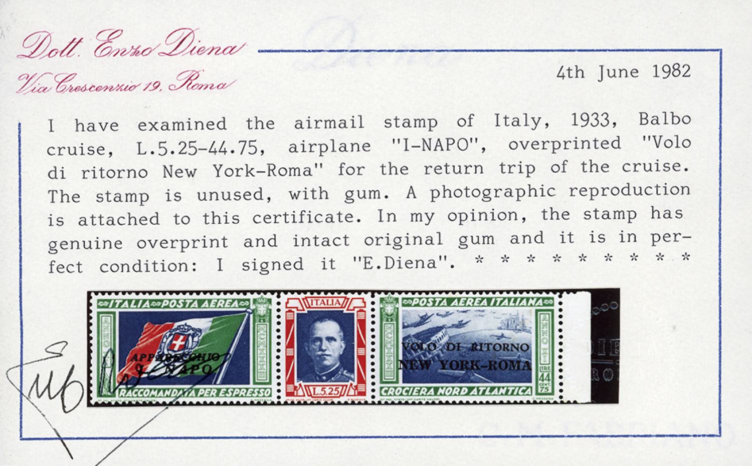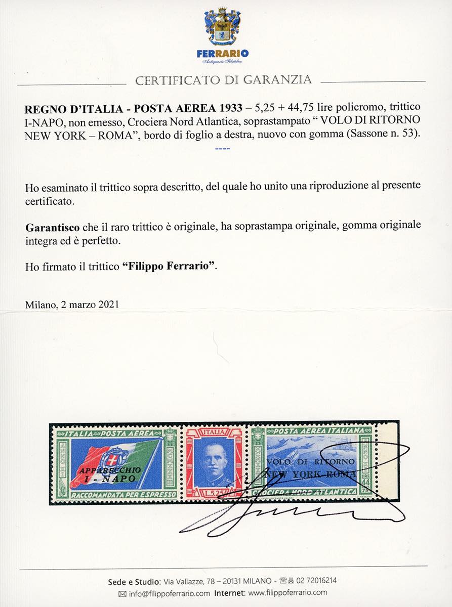1933 - 5,25 + 44,75 lire Trittico I-NAPO, soprastampato "Volo di ritorno" (53), bordo di foglio, gomma originale integra, perfetto e ben centrato. Molto bello. Giulio Bolaffi, cert. E.Diena e Ferrario.