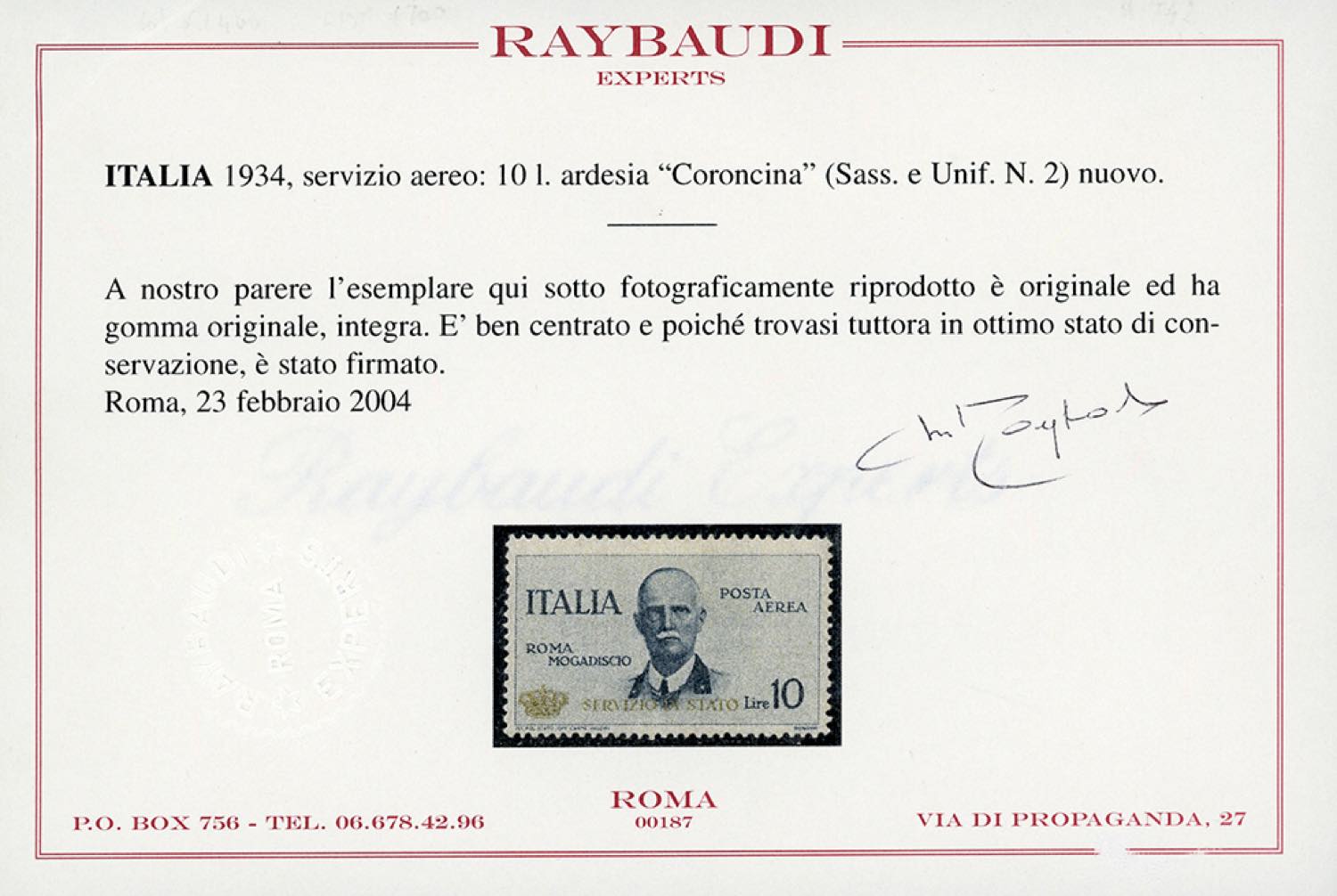 1934 - 10 lire Coroncina (2), nuovo, gomma originale integra, perfetto e ben marginato. A.Diena, cert. Raybaudi.