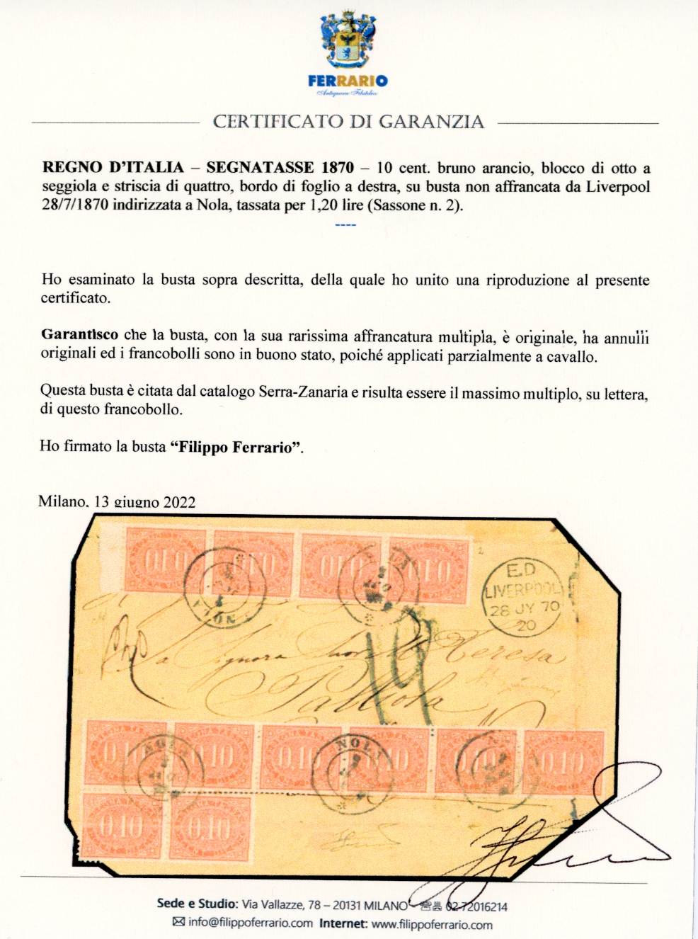 1870 - 10 cent. bruno arancio (2), blocco di otto a seggiola e striscia di quattro, difetti, su busta non affrancata da Liverpool 28/7/1870 a Nola, tassata per 1,20 lire. Si tratta del massimo blocco e multiplo su lettera di questo francobollo, citato dal cat. Serra-Zanaria. Rarissima e d'effetto! Em. ed A.Diena, Chiavarello, cert. Ferrario.
