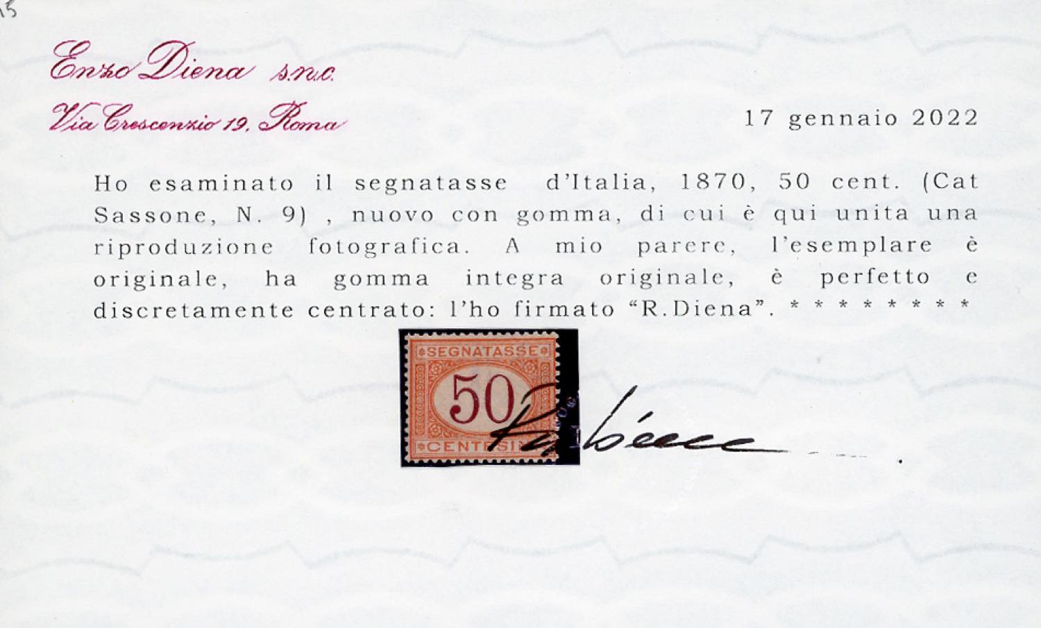 1870 - 50 cent. ocra e carminio (9), ottima centratura, gomma originale integra, perfetto. Molto bello. Sorani, cert. Sorani.