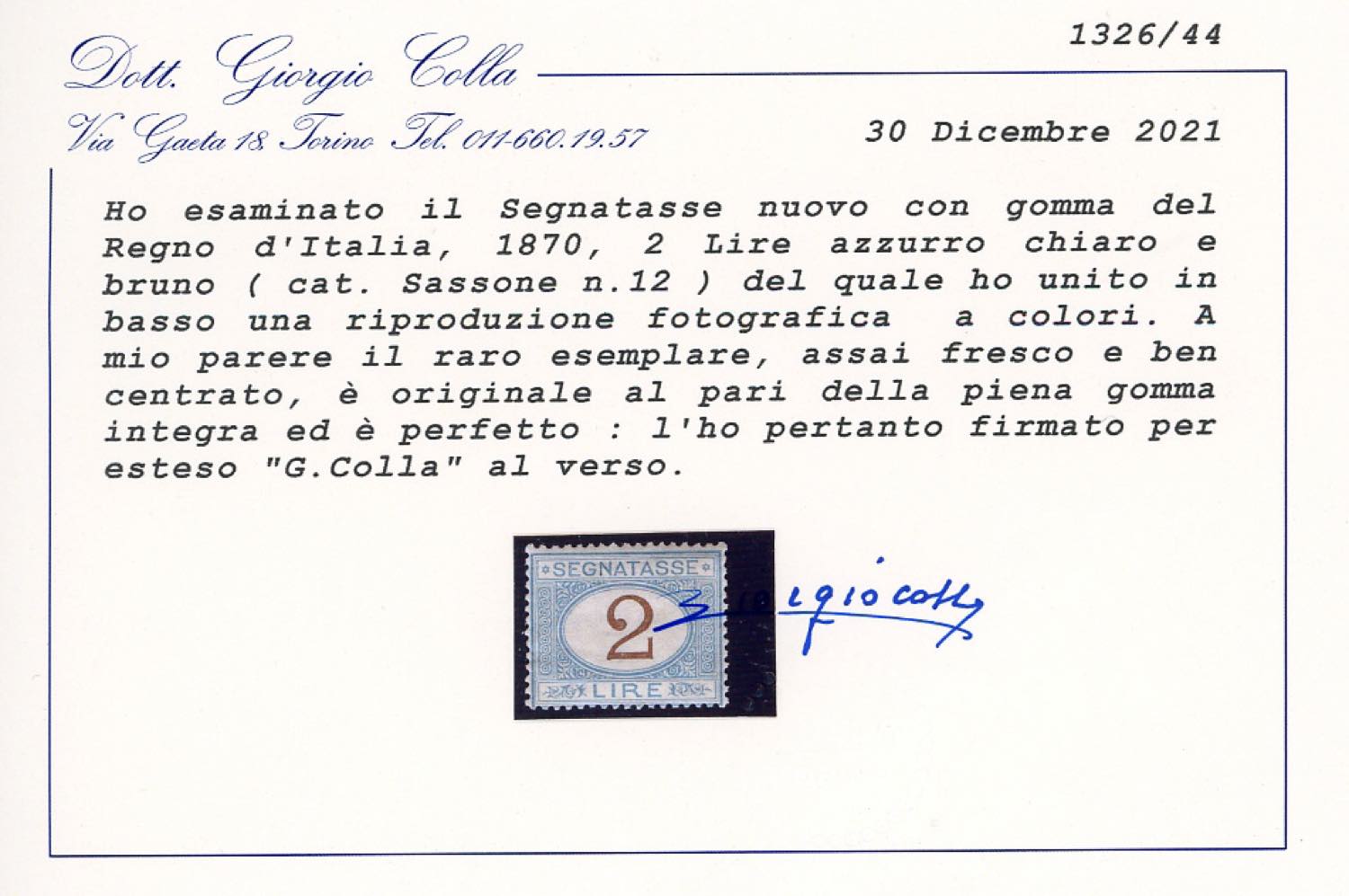 1870 - 2 lire azzurro chiaro e bruno (12), buona centratura, gomma originale integra, perfetto. Bello e non comune di questa qualità. Cert. Colla.