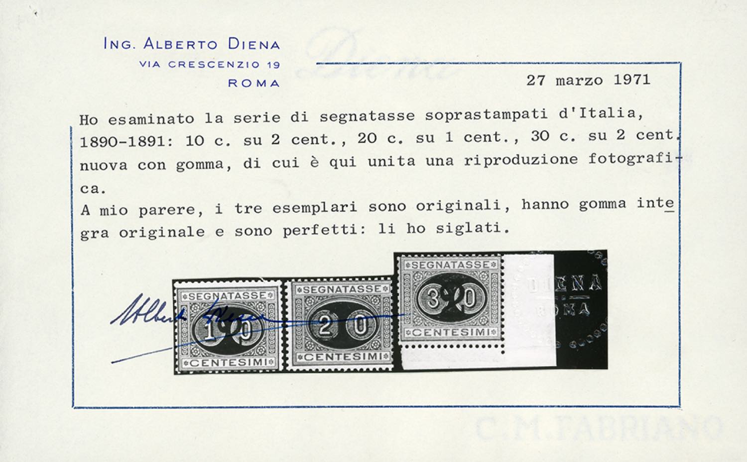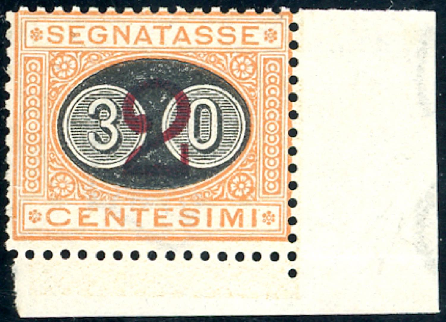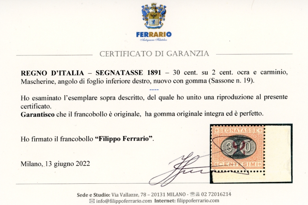 1891 - 30 cent. su 2 cent. Mascherine soprastampato (19), angolo di foglio, nuovo, gomma originale integra, perfetto. Splendido. Cert. A.Diena, Ferrario. (cat. Sassone € 6.000/15.000)