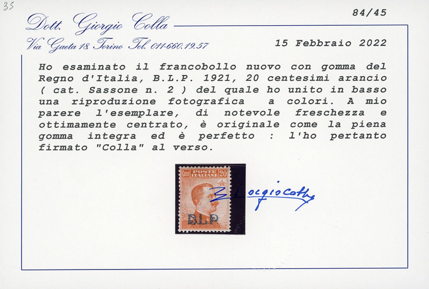 1921 - 20 cent. soprastampa B.L.P. del I tipo (2), nuovo, gomma originale integra, perfetto. Molto fresco e ottimamente centrato. Raro di questa qualità. Cert. Colla.