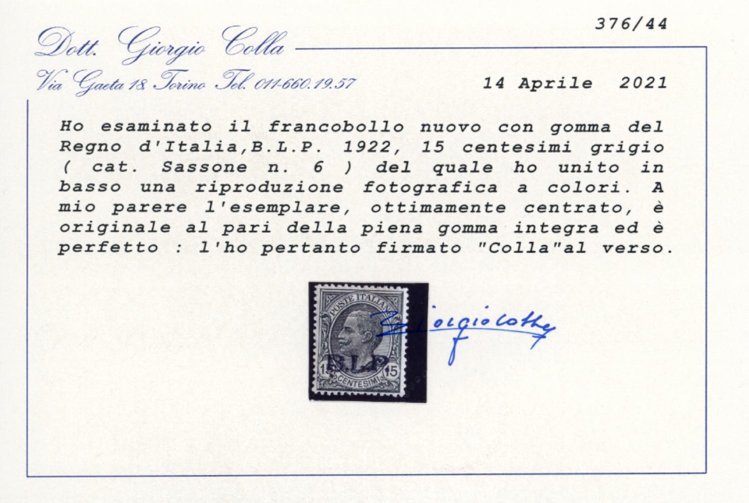 1922 - 15 cent. soprastampato BLP, II tipo (6), ottima centratura, gomma originale integra, ottimo stato. A.Diena, cert. Colla.