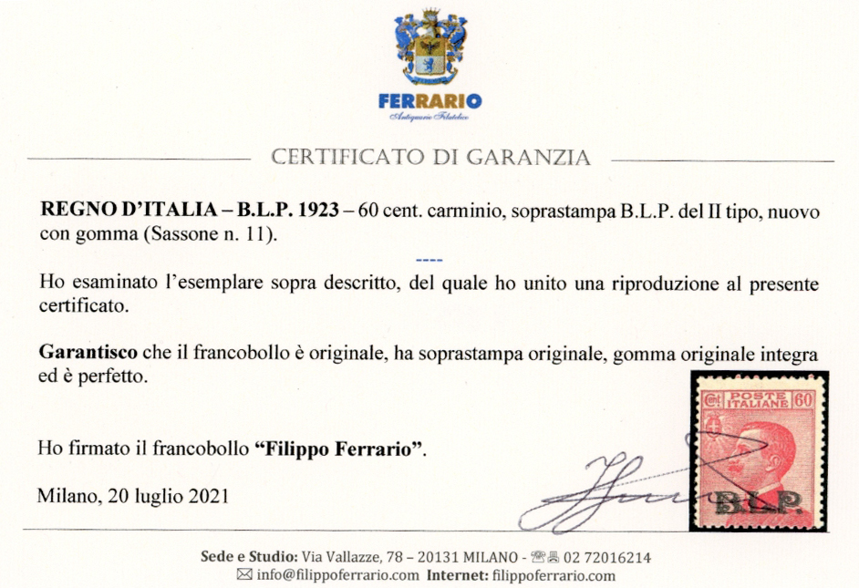 1923 - 60 cent. soprastampa BLP del II tipo (11), gomma originale integra, perfetto. A.Diena, cert. Ferrario e Diena.