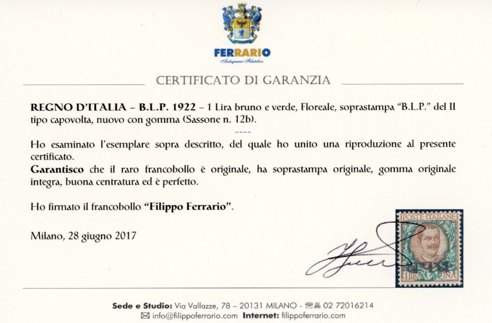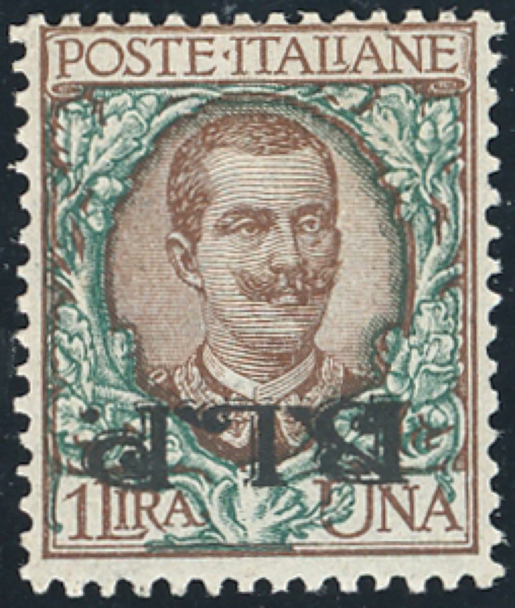 1922 - 1 lira soprastampa BLP del II tipo capovolta (12b), nuovo, gomma originale integra, perfetto e di buona centratura. Fresco e raro. Sorani. Cert. Ferrario.