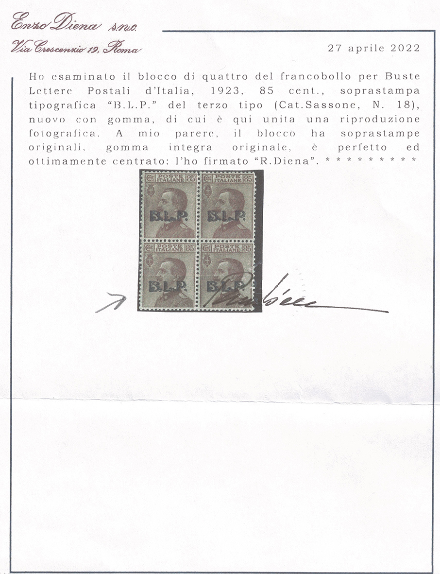 1923 - 85 cent. bruno rosso, soprastampa B.L.P. del III tipo (18), nuovo, gomma originale integra, perfetto. Molto fresco e ottimamente centrato. Fotocopia cert. Diena della quartina di provenienza.