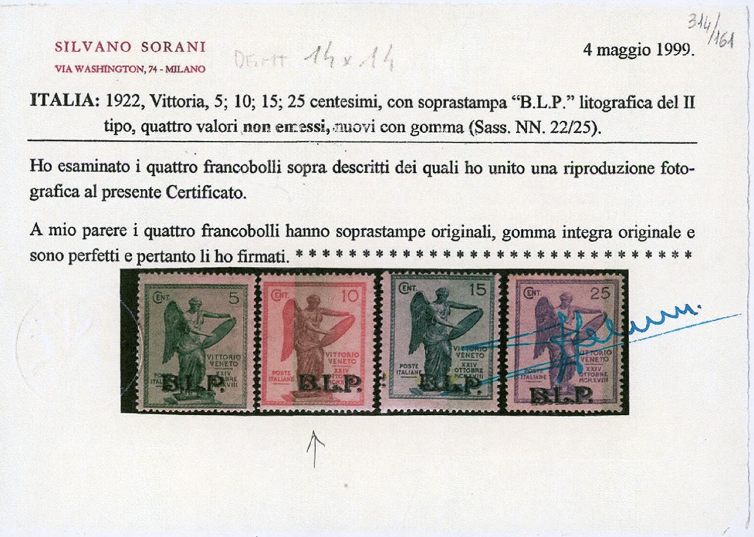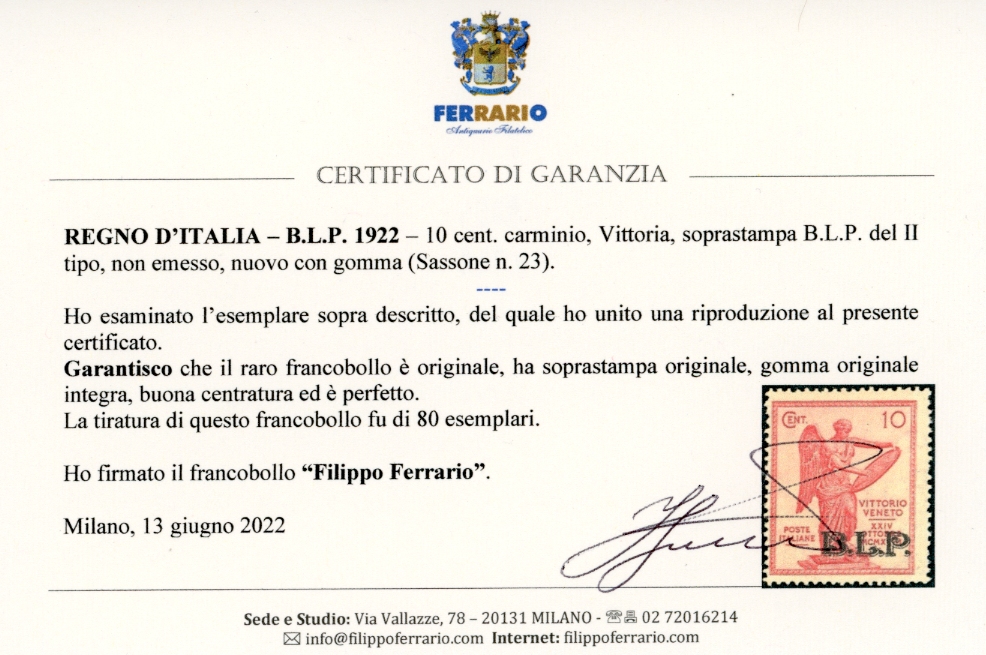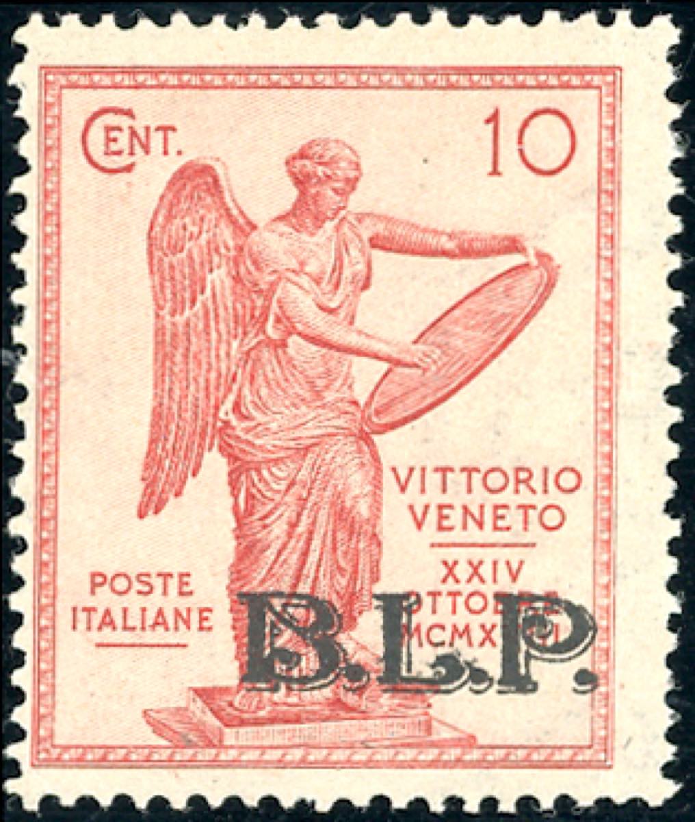 1922 - 10 cent. Vittoria, soprastampa B.L.P. del II tipo, non emesso (23), gomma originale integra, perfetto e ben centrato. Molto fresco. Tiratura 80 esemplari. Fotocopia cert. Sorani della serie di provenienza, cert. Ferrario.
