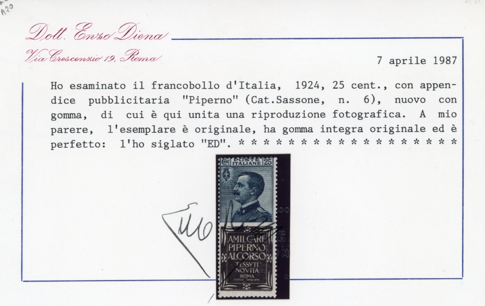 1924 - 25 cent. Piperno (6), gomma originale integra, perfetto. A.Diena, cert. E.Diena e Ferrario.