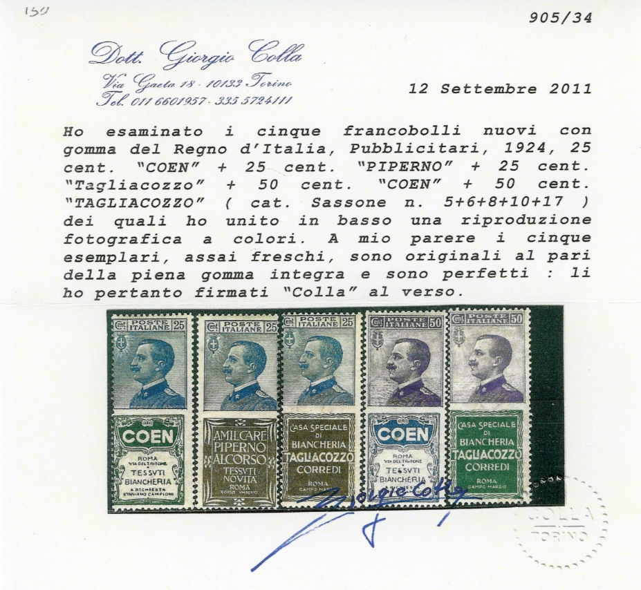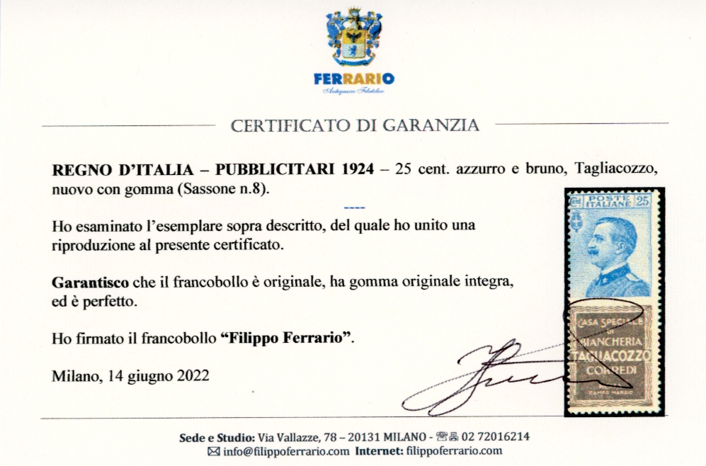 1924 - 25 cent. Tagliacozzo (8), gomma originale integra, perfetto. Cert. Ferrario, fotocopia cert. Colla.