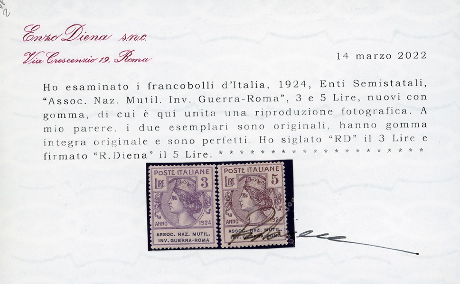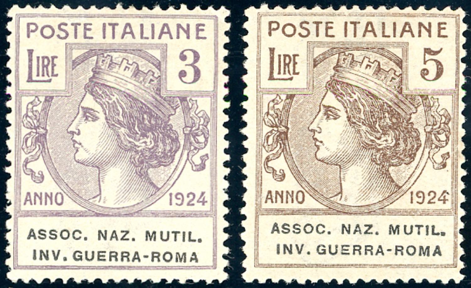 ASSOC. NAZ. MUTIL. INV. GUERRA - ROMA 1923 - 3 e 5 lire, gli altri valori della serie (11/12), nuovi, gomma originale integra, perfetti. ... Read more
