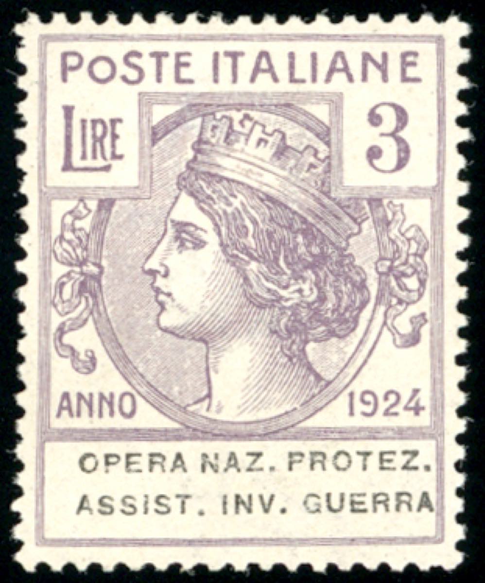 OPERA NAZ. PROTEZ. ASSIST. INV. GUERRA 1924 - 3 lire (56), ottima centratura, gomma originale integra, perfetto. G.Bolaffi, cert. Diena.
