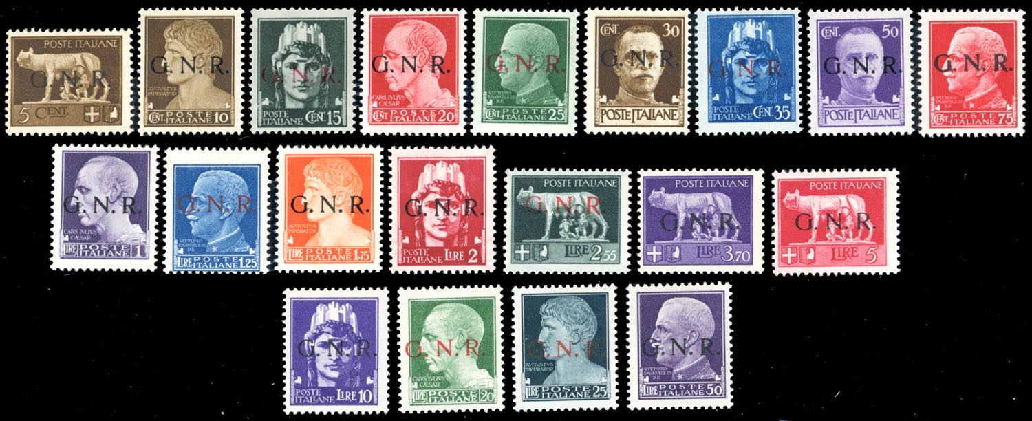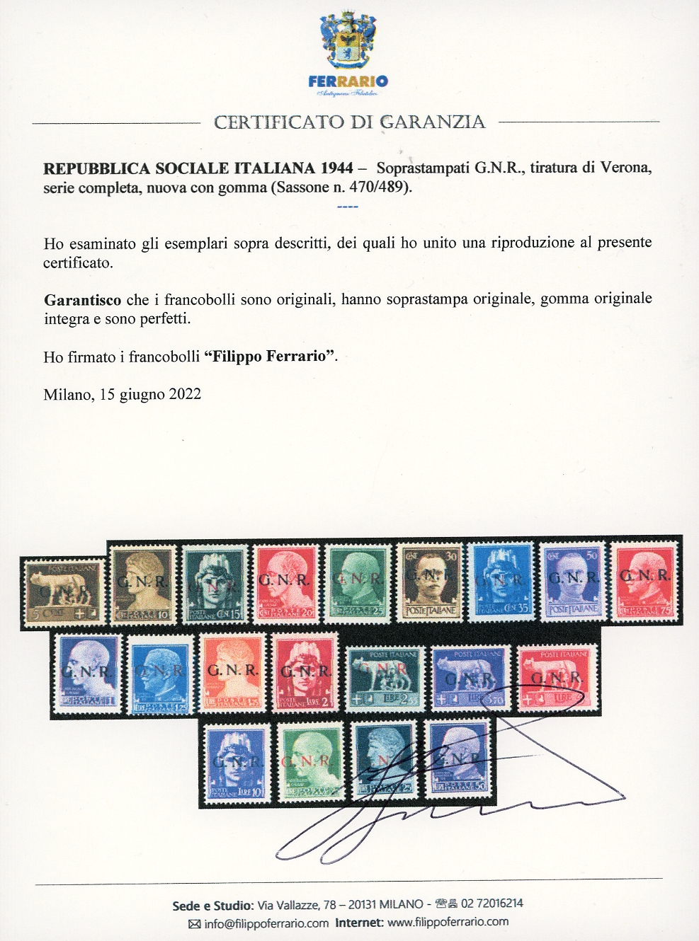 1944 - Soprastampati G.N.R., tiratura di Verona (470/489), gomma originale integra, perfetti. Cert. Ferrario.