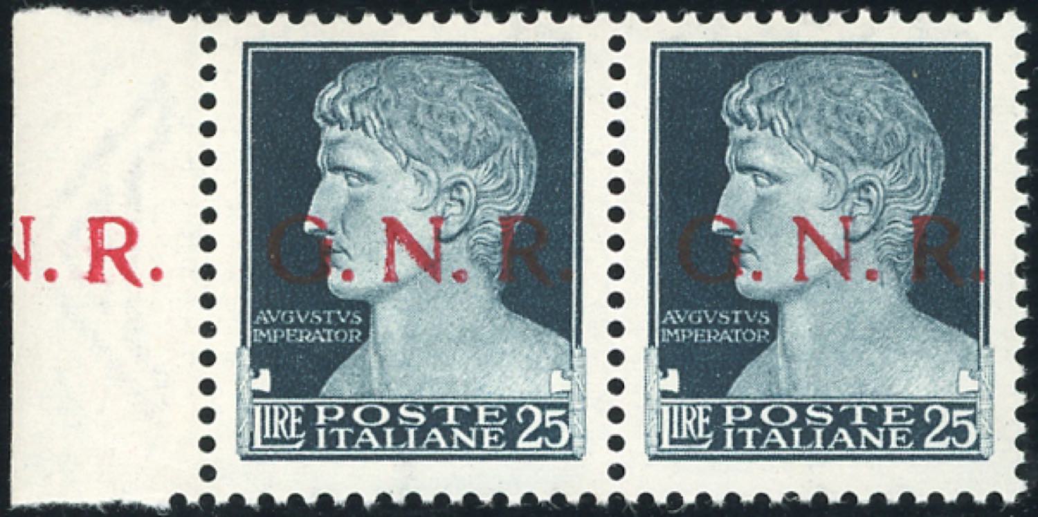 1944 - 25 lire soprastampa G.N.R. di Verona, coppia orizzontale, bordo di foglio con la soprastampa ripetuta (488Kb), gomma originale ... Read more