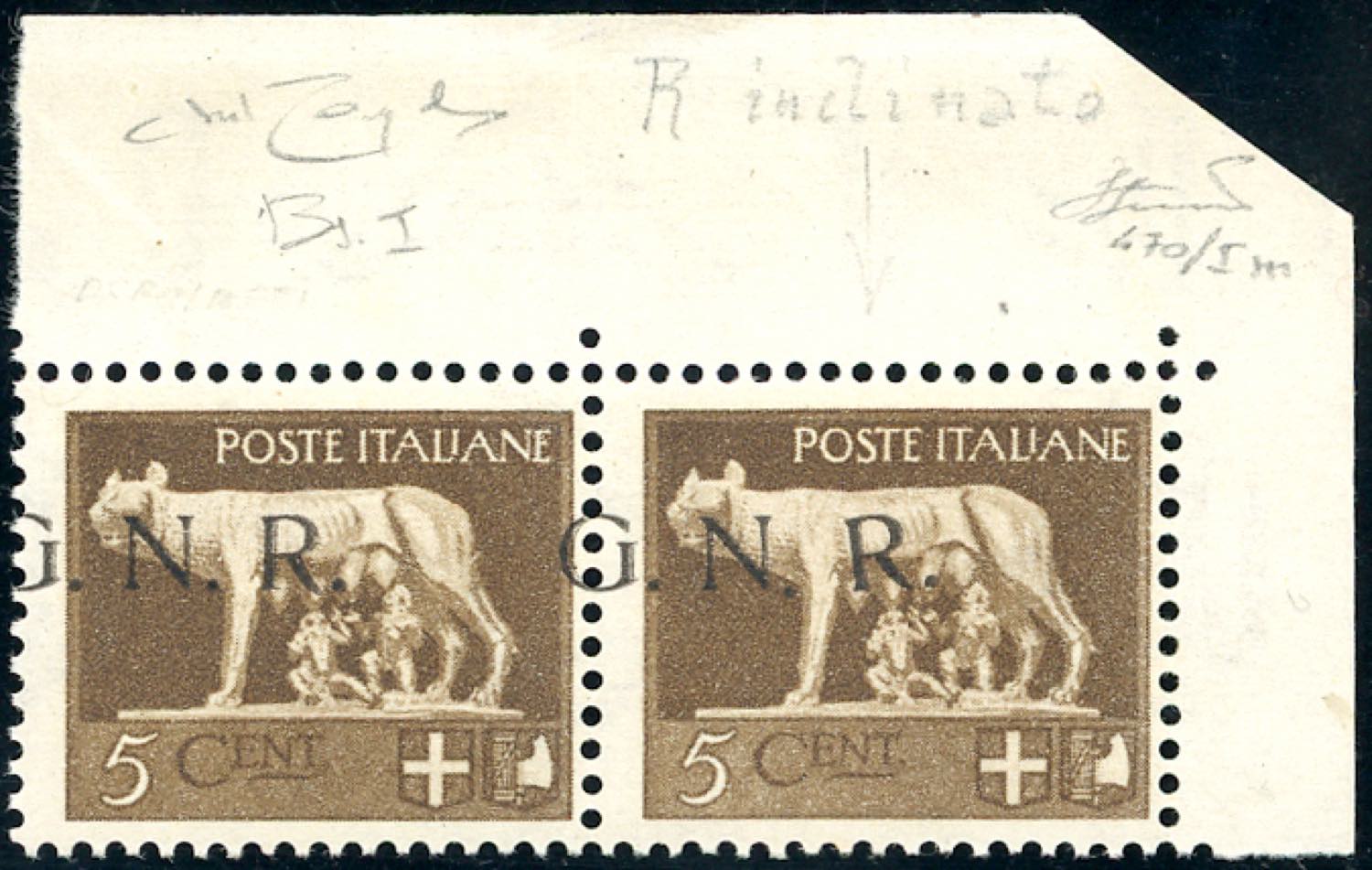 1943 - 5 cent. soprastampa G.N.R. di Brescia, I tipo, fortemente spostata a sinistra, coppia orizzontale, il secondo esemplare con R ... Read more